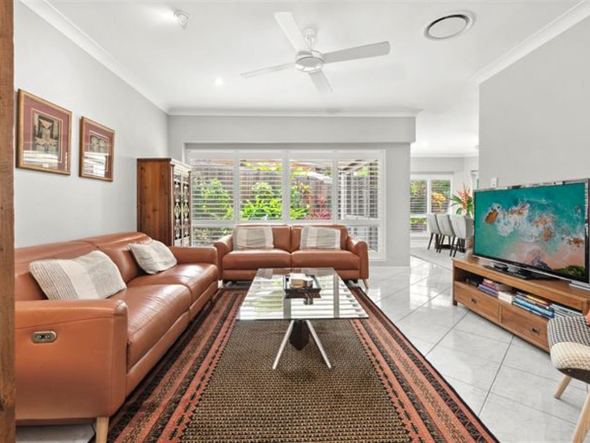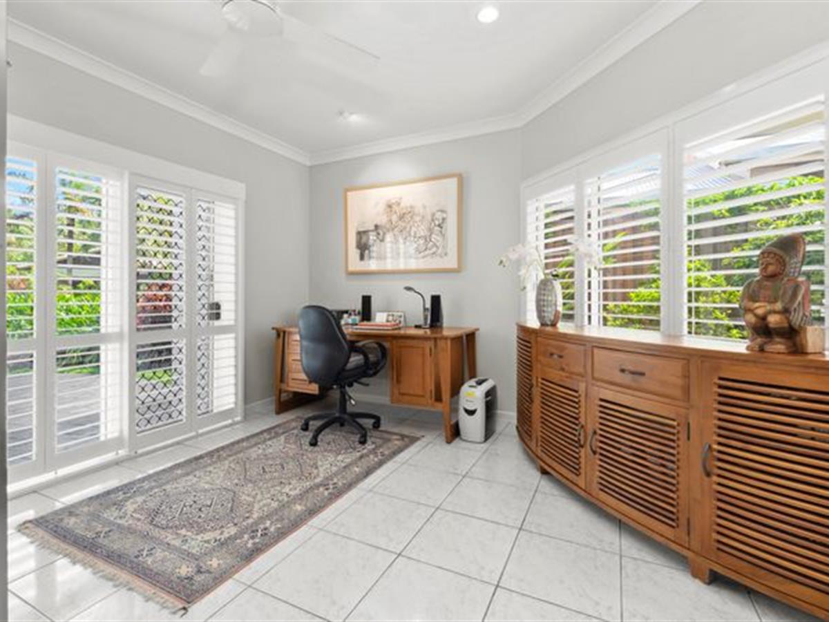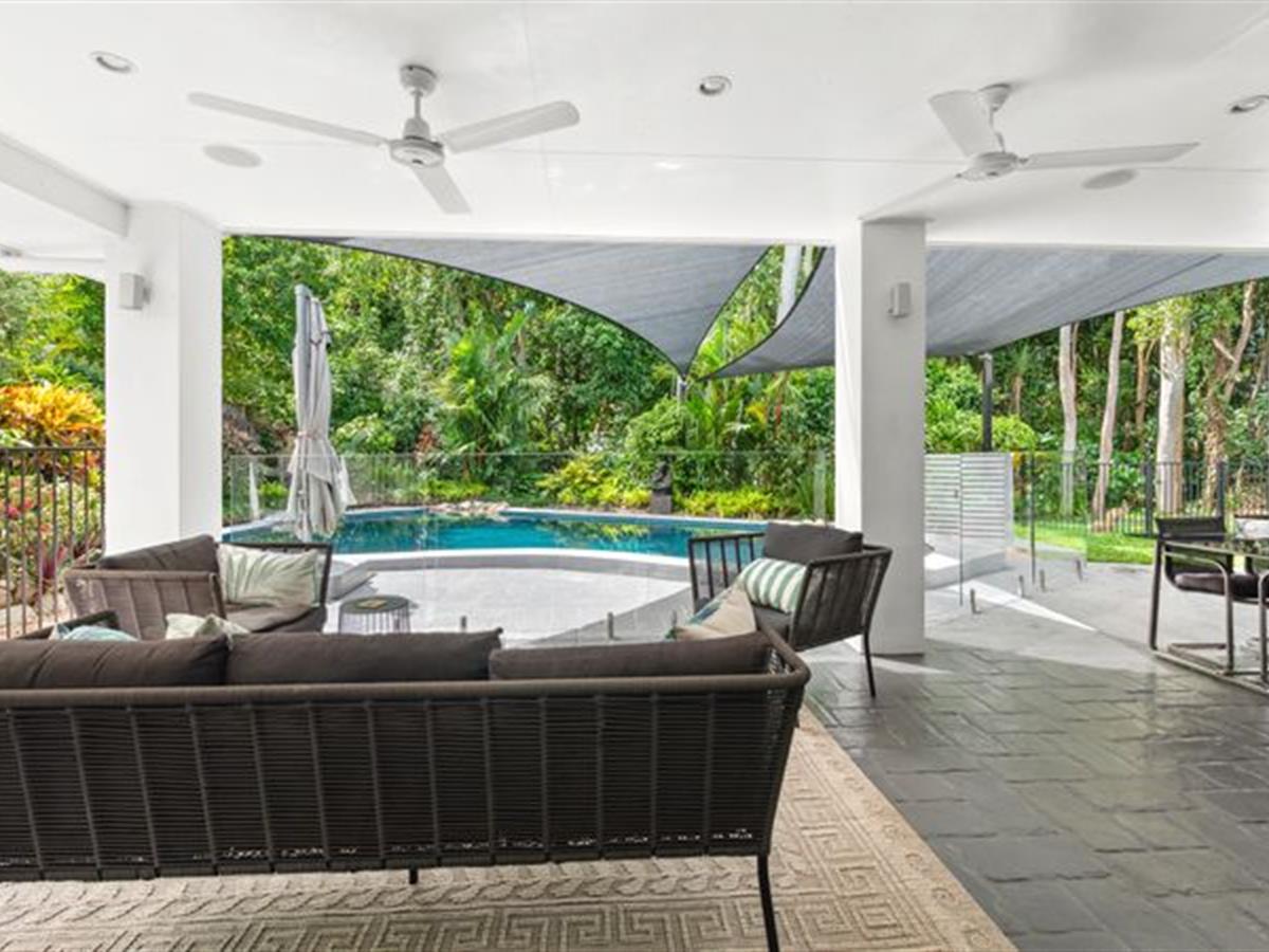 Grand 3 bed property, 5 minutes to Clifton Beach. On entering the home you are greeted in a large entry foyer with double opening doors and high ceilings. This in turn accesses the separate study and media room on the left and the bedroom areas on the right. For those who work at home, the (2.6m x 3.8m) study has a direct external access from the driveway. Beautifully presented, this delightful large 3 bedroom family home has all the comforts required in the tropics. As you enter you are greeted with a lush mature tropical vista from the kitchen and living area. With no rear neighbour, the large under main roof patio / entertainment area overlooks the pool and lush, mature rainforest. Relax and watch the wonderful birdlife and the wallabies come to up to the fence. The large open plan living area includes a media room, Fully refitted kitchen with quality appliances, dining and lounge. The master bedroom has a fully fitted WIR and ensuite. The 2 remaining bedrooms are serviced by a large separate bathroom and separate toilet. Natural cooling, enhanced by a high pitched roof and insulation. Plantation shutters fitted throughout.