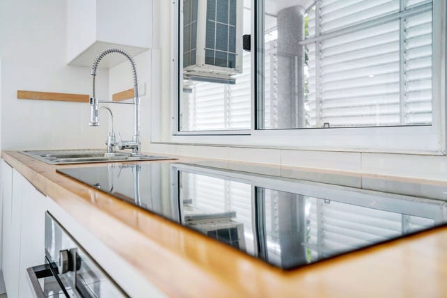 - Renovated Entertainers Kitchen with oversized central island and breakfast bar, solid timber feature benchtops, pull out pantry, double fridge space, 900mm electric cooktop and 900mm chefs' oven and views.