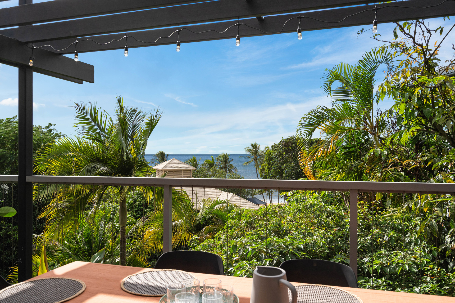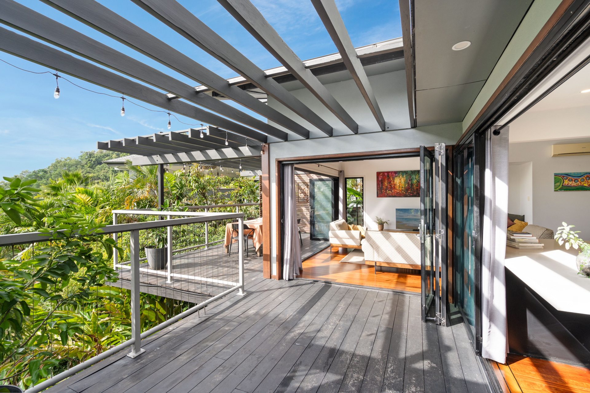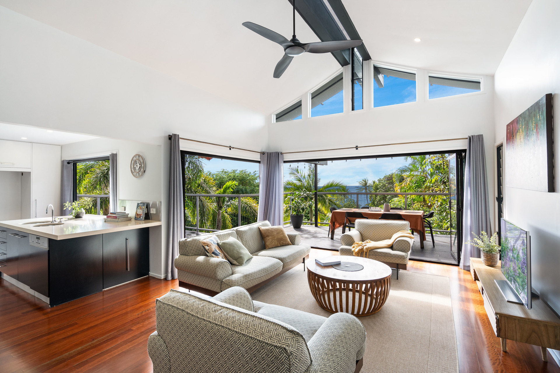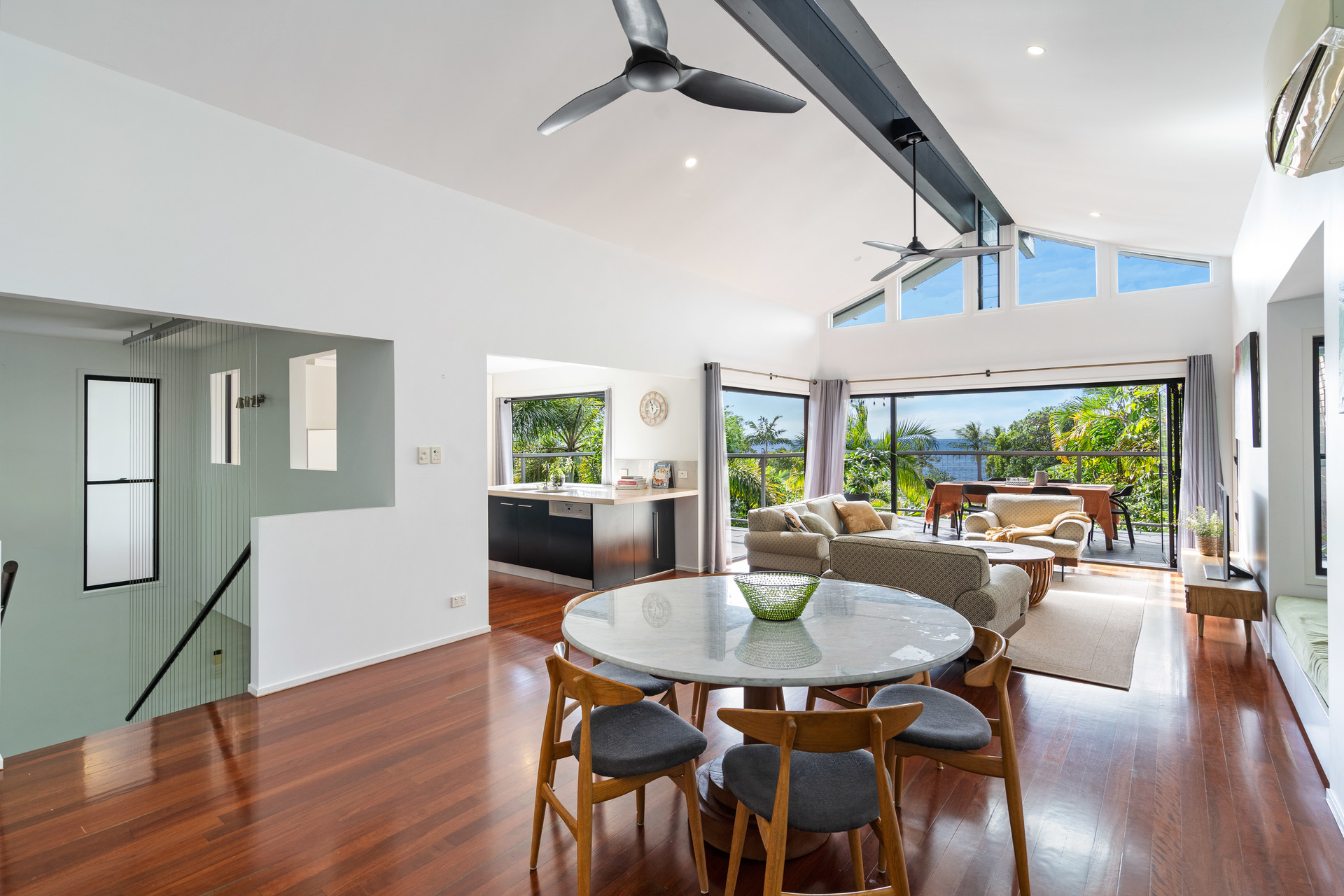 - Full-width entertaining deck at tree-top level with ocean views - Three upstairs bedrooms, all with views, plus study/fifth bedroom