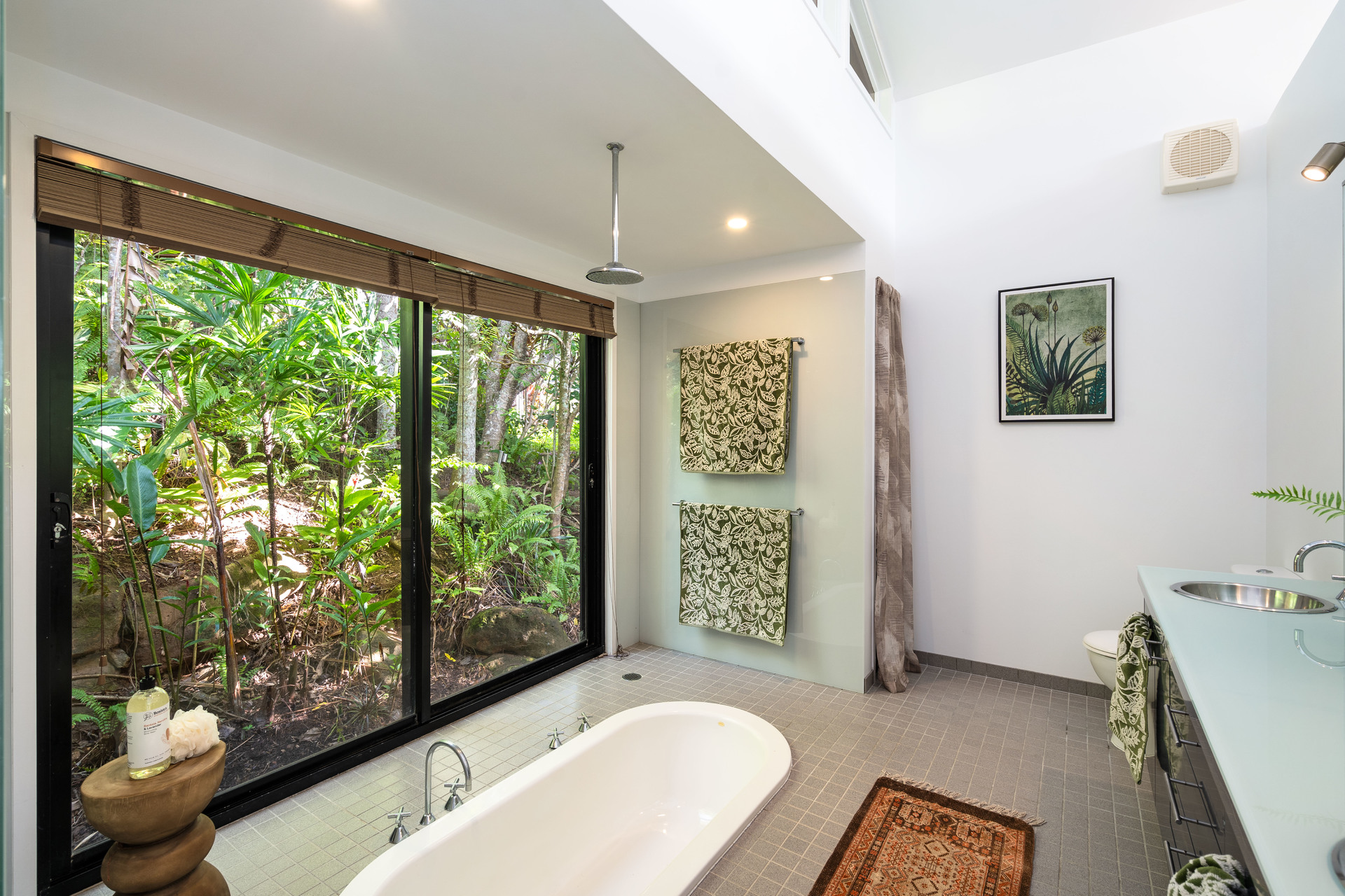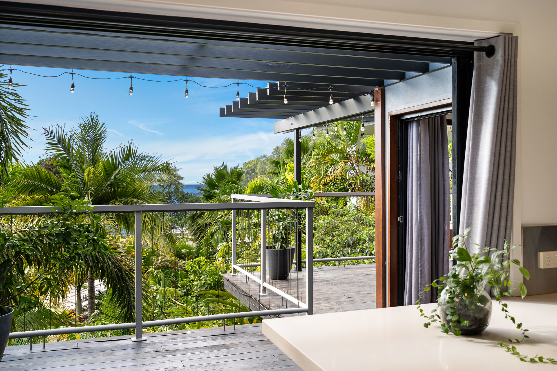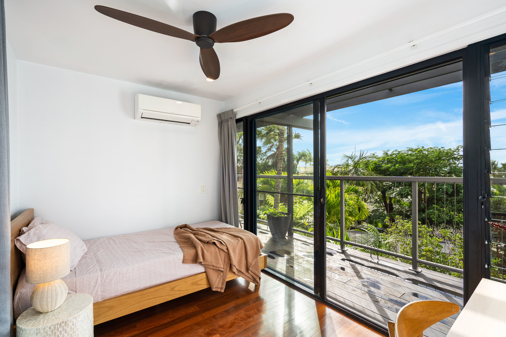 - Full-width entertaining deck at tree-top level with ocean views - Three upstairs bedrooms, all with views, plus study/fifth bedroom