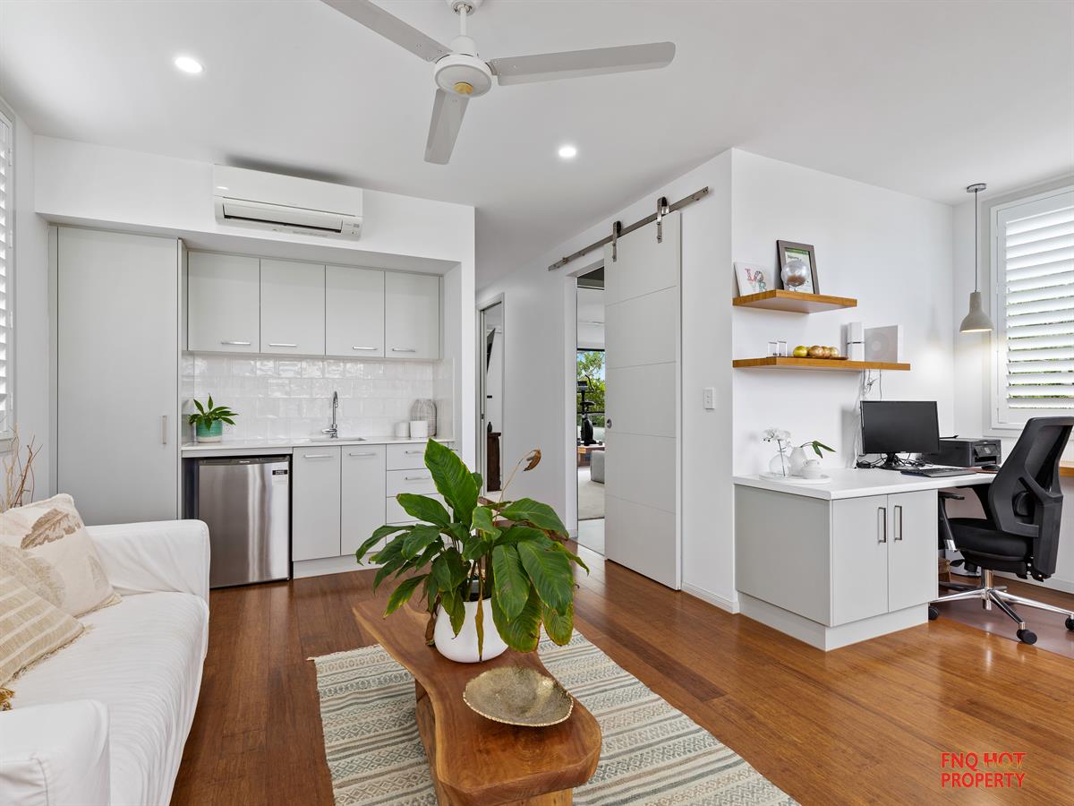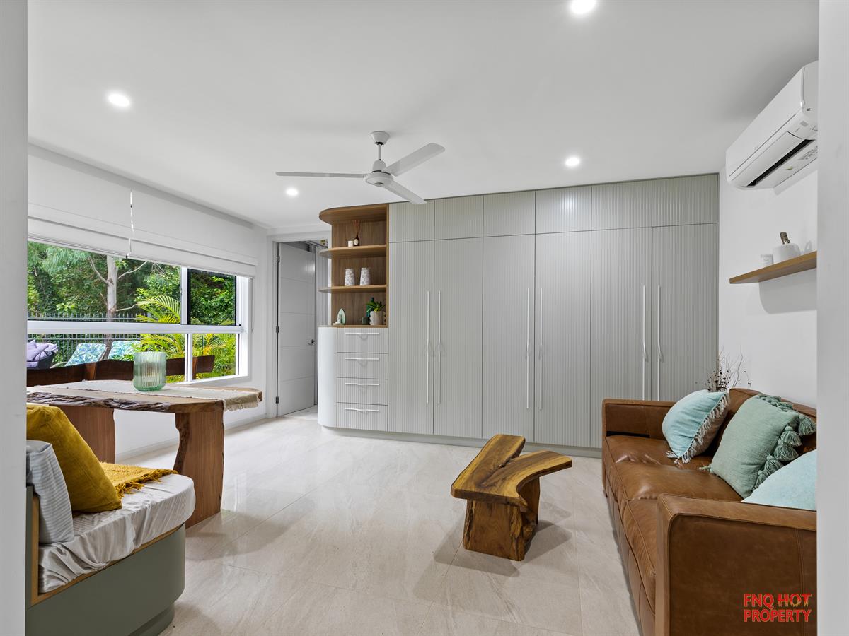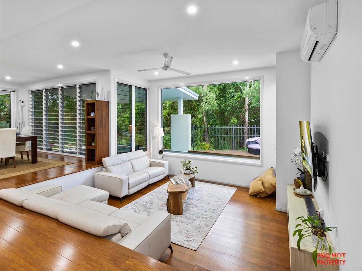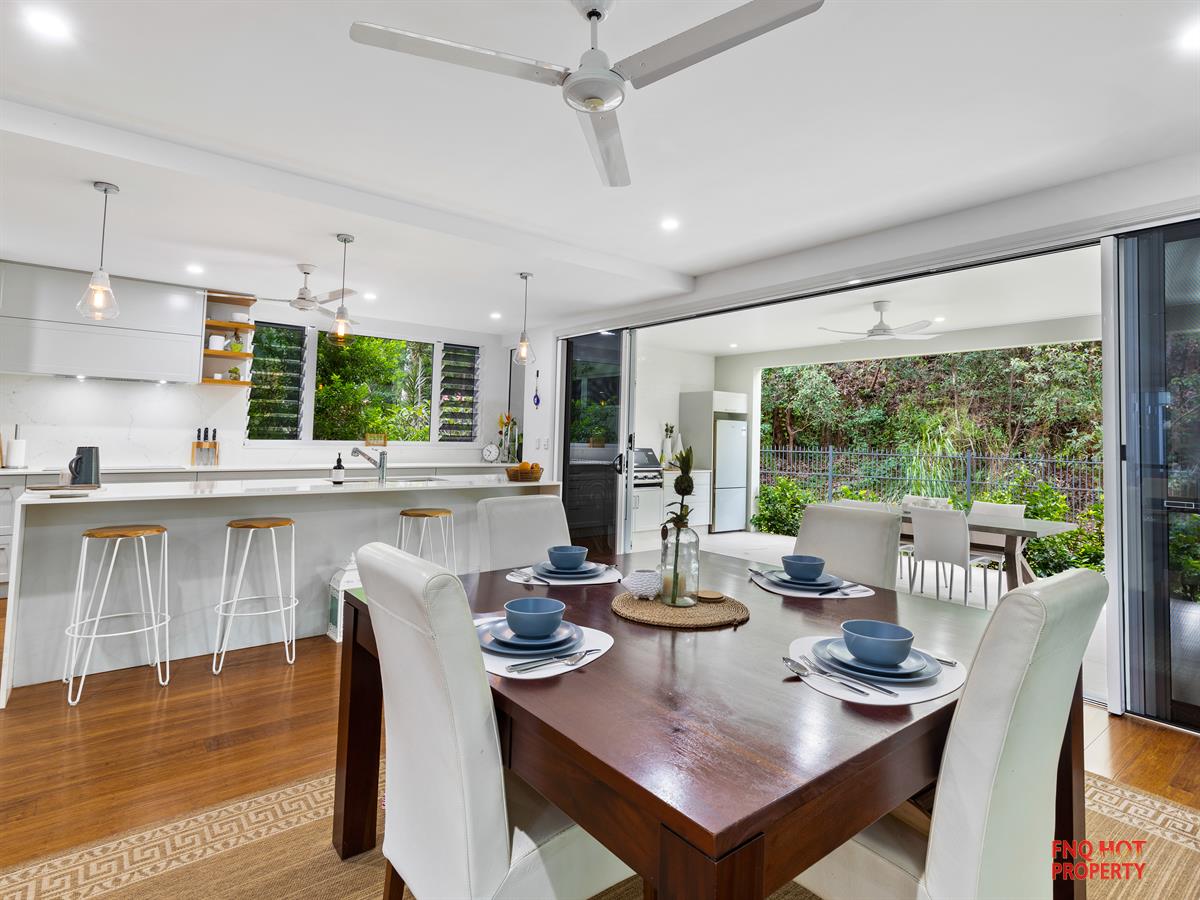 stacker doors to deck, Designed for effortless living inside and out, there is minimal maintenance, and the 1018m2 block that is fully fenced and private. The ambience is calm and soothing, you can hear the Coral Sea rolling in and out. This is a haven of relaxation and peace, where you truly feel in harmony with nature, from bush to ocean.