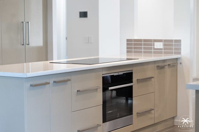 - Standout island bench kitchen with plenty of storage and cabinetry space, electric stove and oven, servery to the outdoors and views of the outdoors.