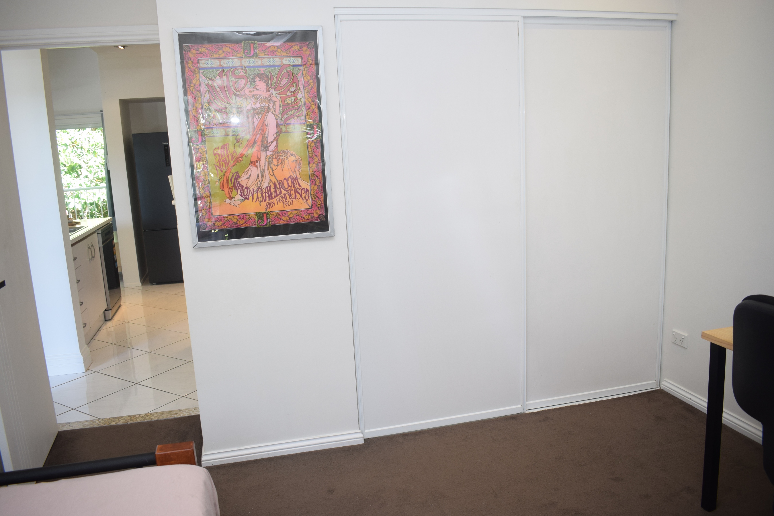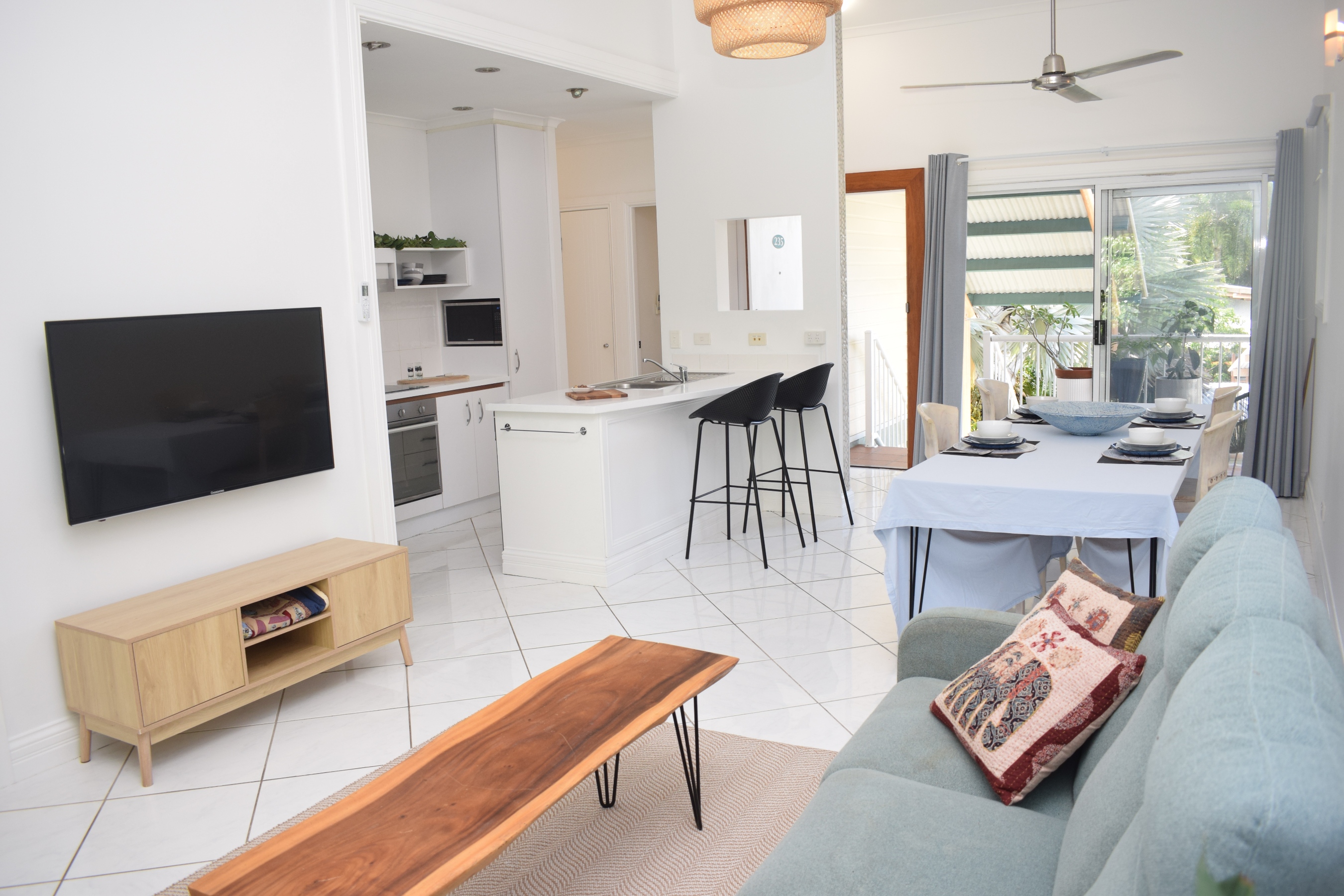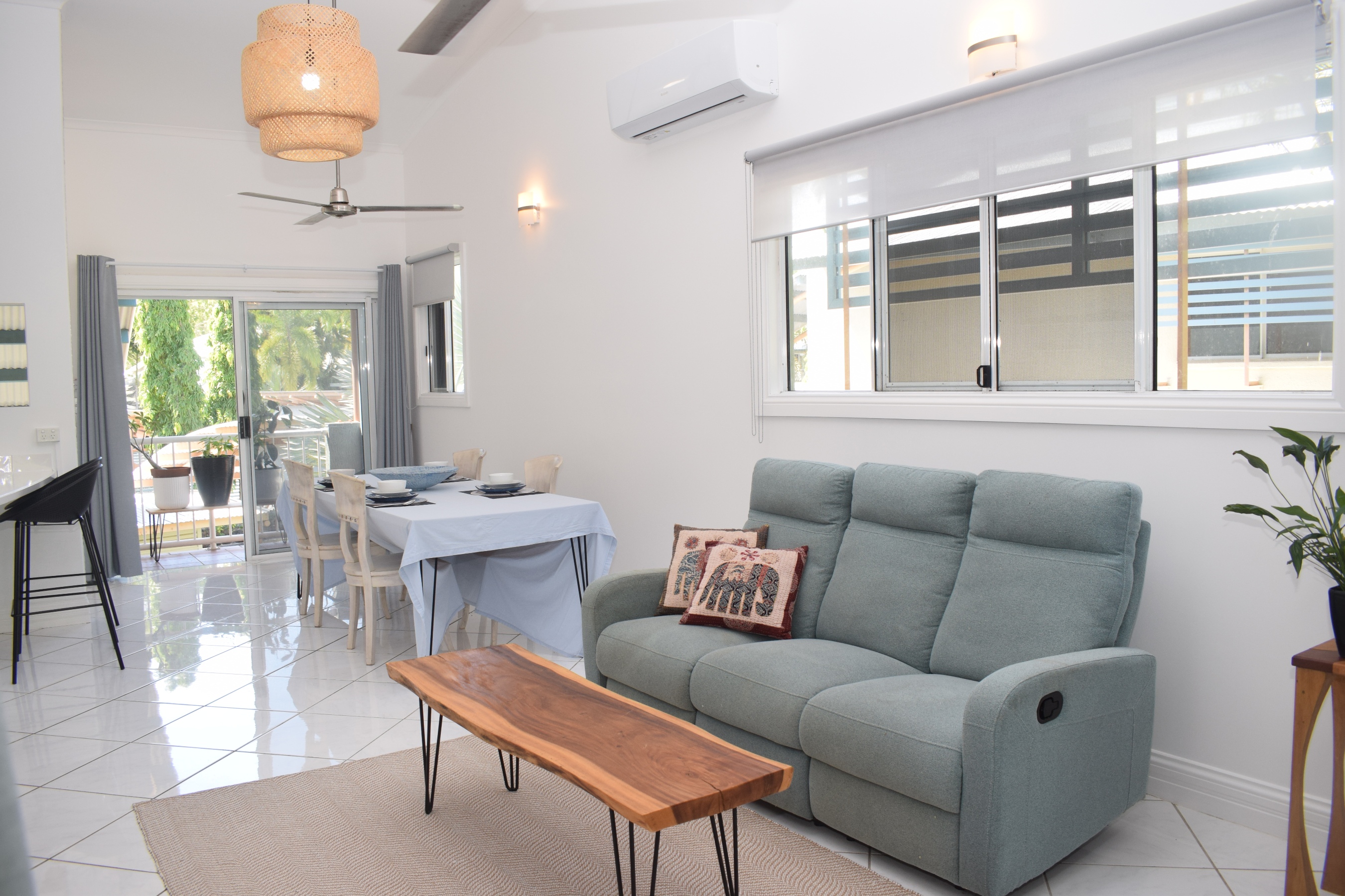 *Huge, open plan living and dining area with two balconies and a brand new, large split system air conditioner. The multiple windows and large glass doors at each end of the property allow for cooling breezes and light to flood through the apartment.