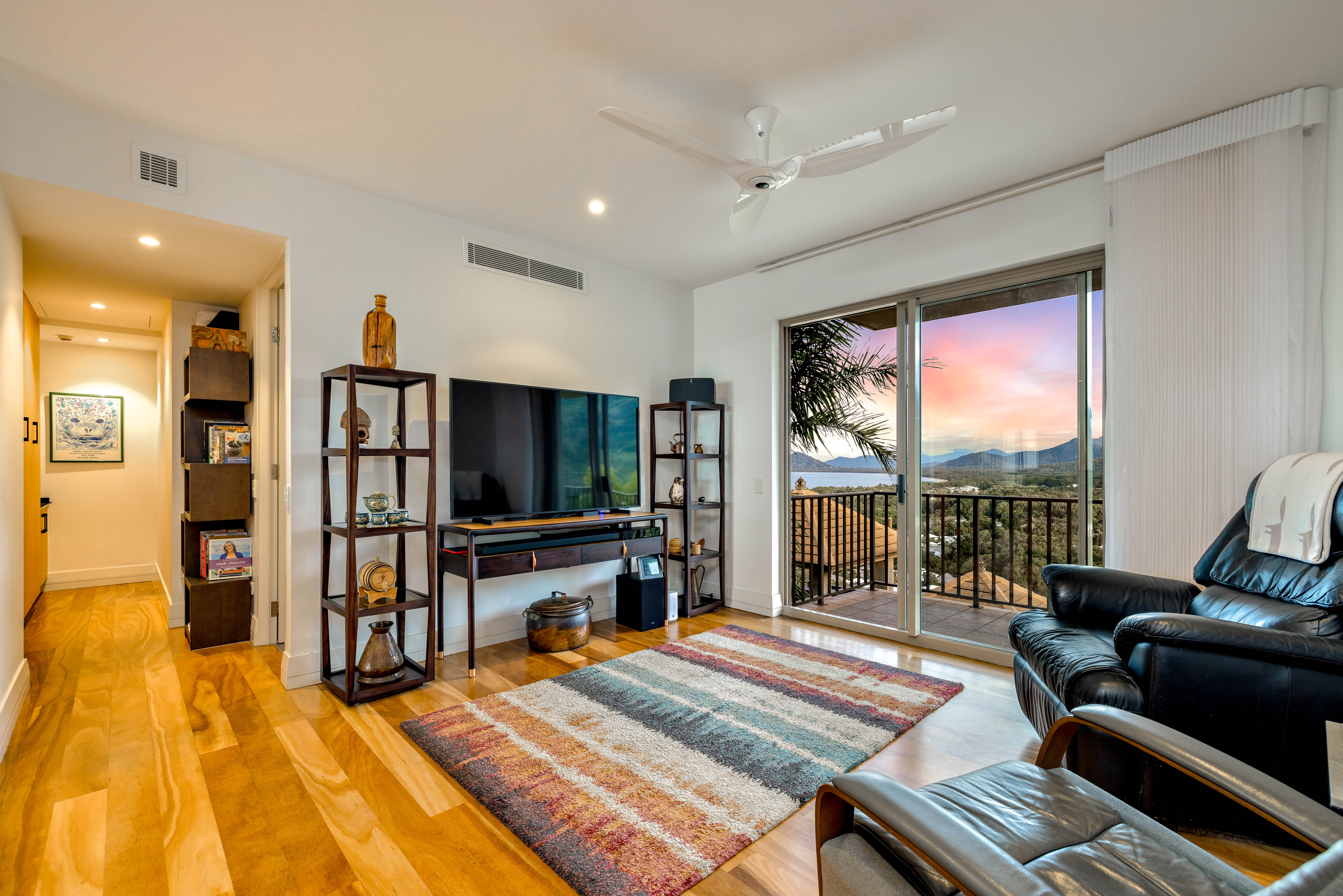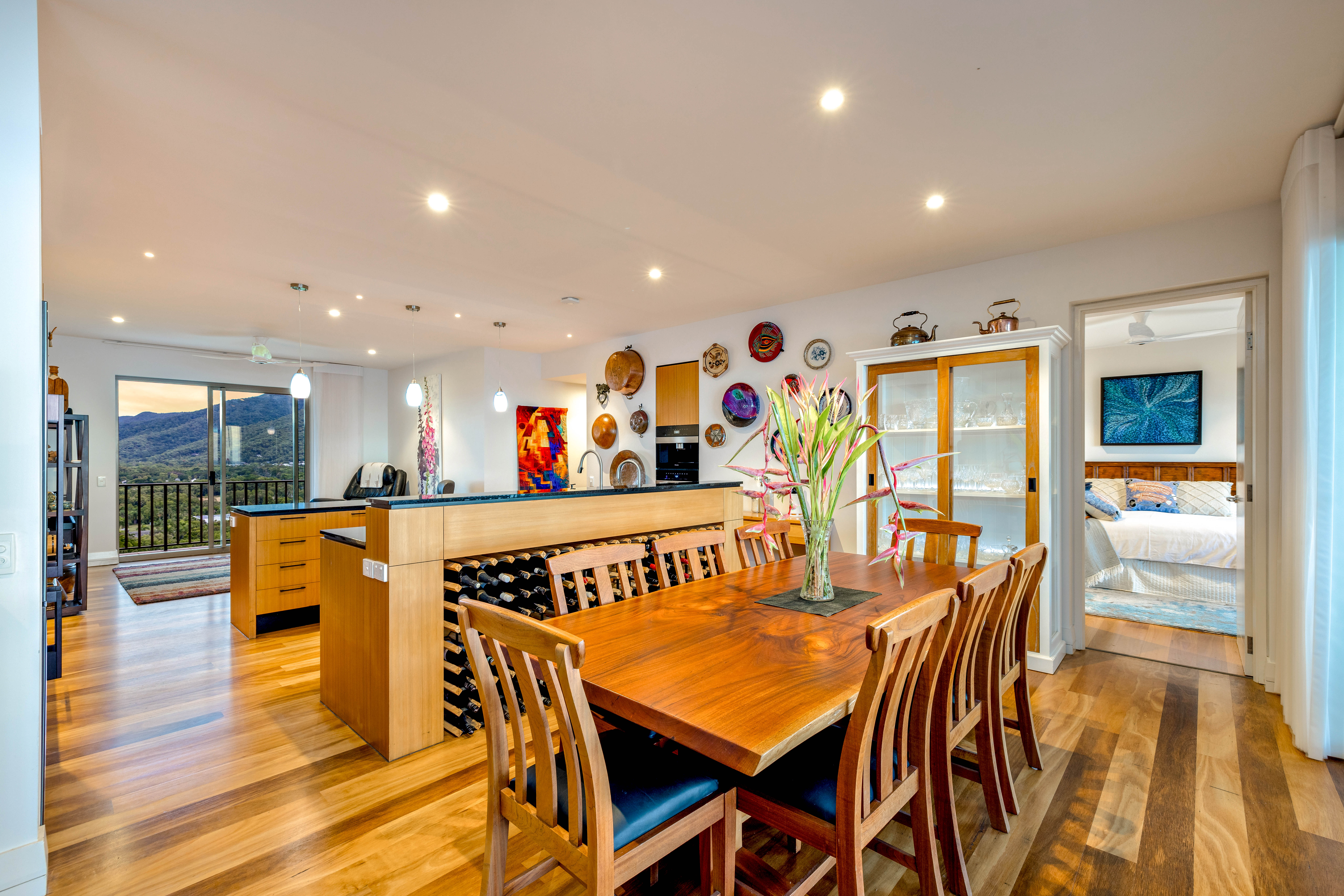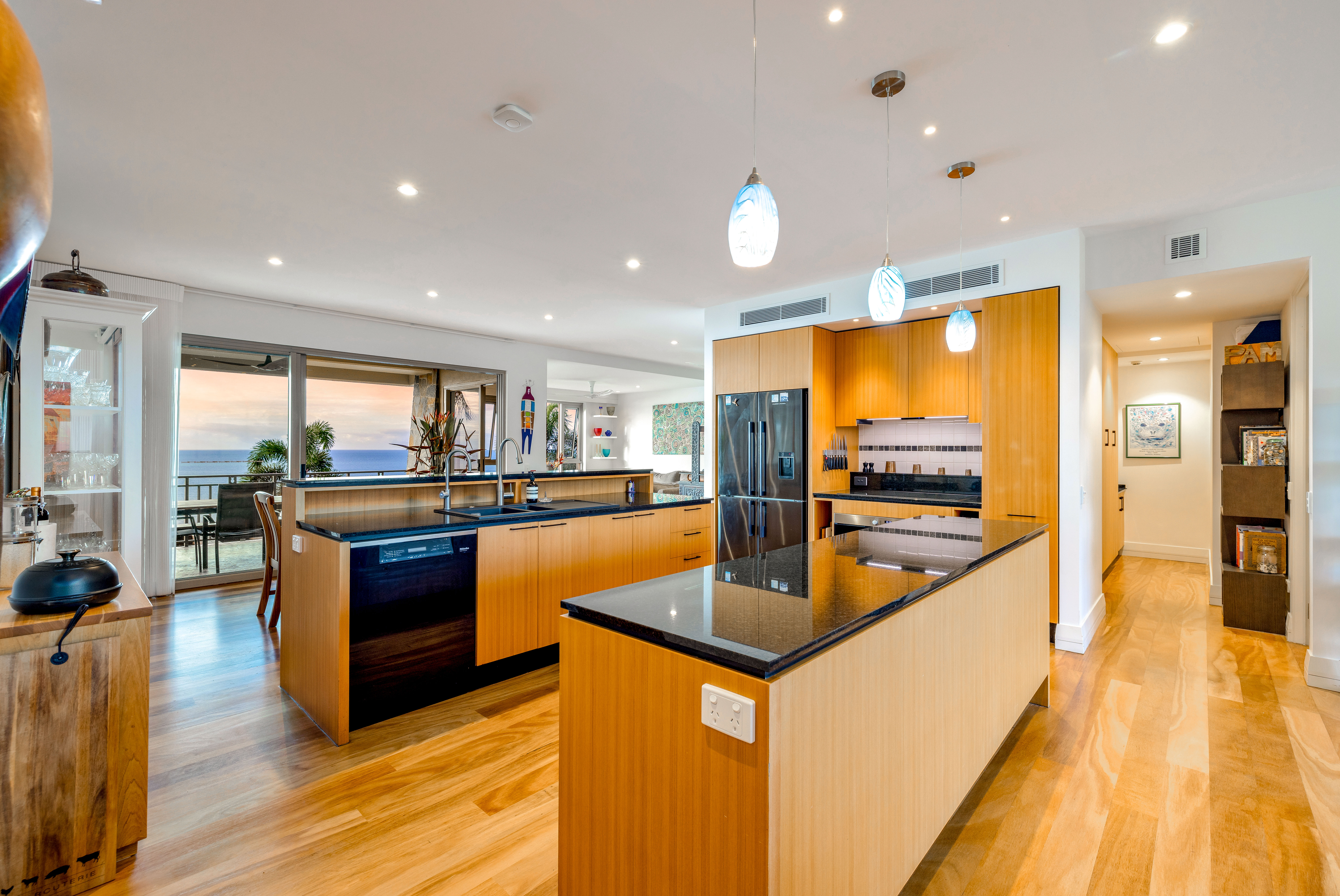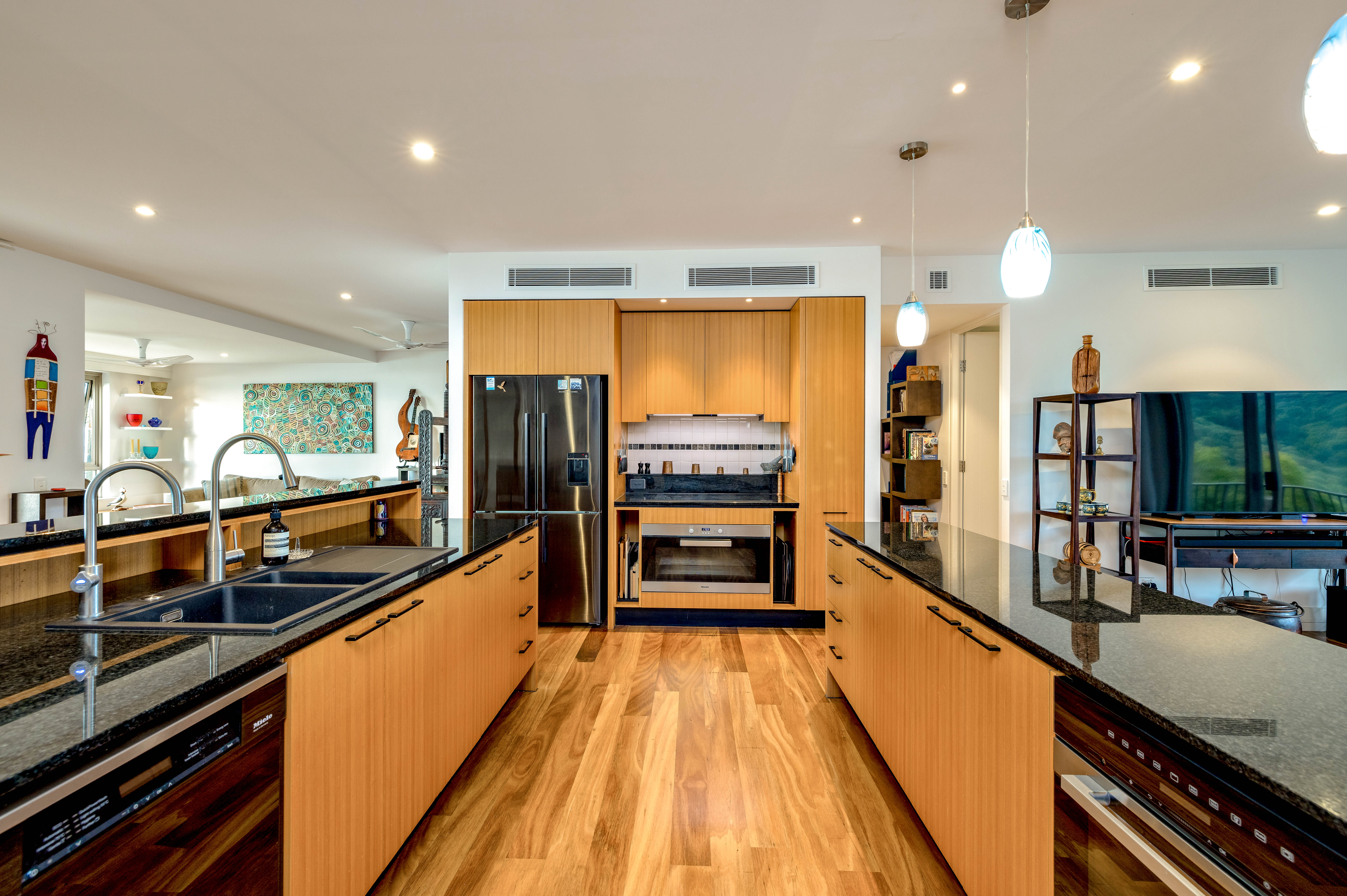 The apartment exudes an impressive array of features and amenities. With Blackbutt hardwood floors throughout, it offers two distinct living areas: one upon entering and the other on the opposite side of the apartment. Moving through to the dining zone adjacent to the kitchen, a bank of sliding glass doors open wide to the larger of two balconies. Here, you will enjoy the serene vantage point of the constant presence of the ocean and magnificent sunsets to the north towards Port Douglas & Cape Tribulation.