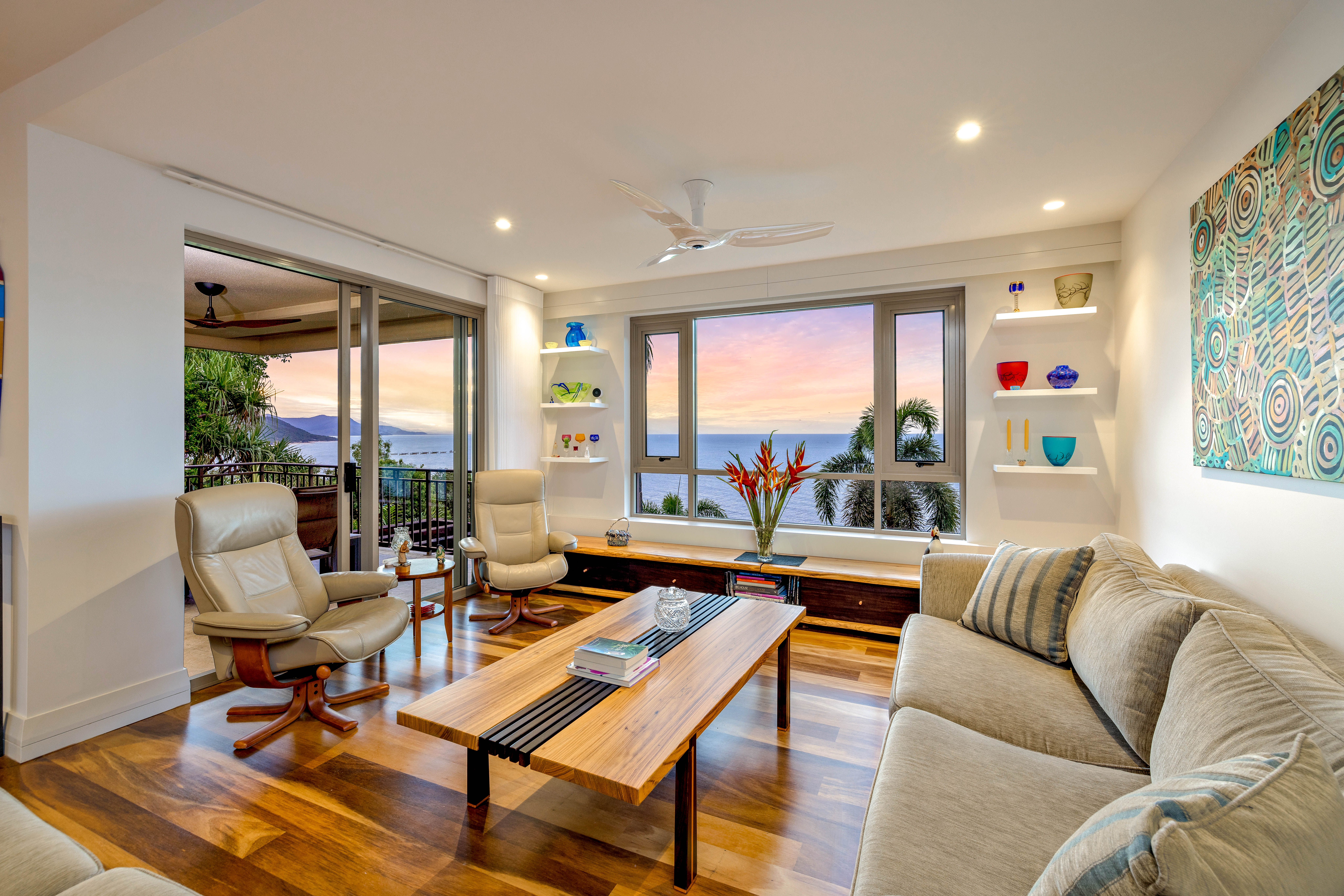 & Palm Cove Views Embrace the essence of coastal living in this refined apartment located within the highly regarded 'Santai' building, positioned on the pinnacle of Buchan Point in Palm Cove. Savor sweeping ocean views and magnificent sunsets from this majestic location. Adorned with unique features, this apartment has been meticulously enhanced by the owner-occupiers.