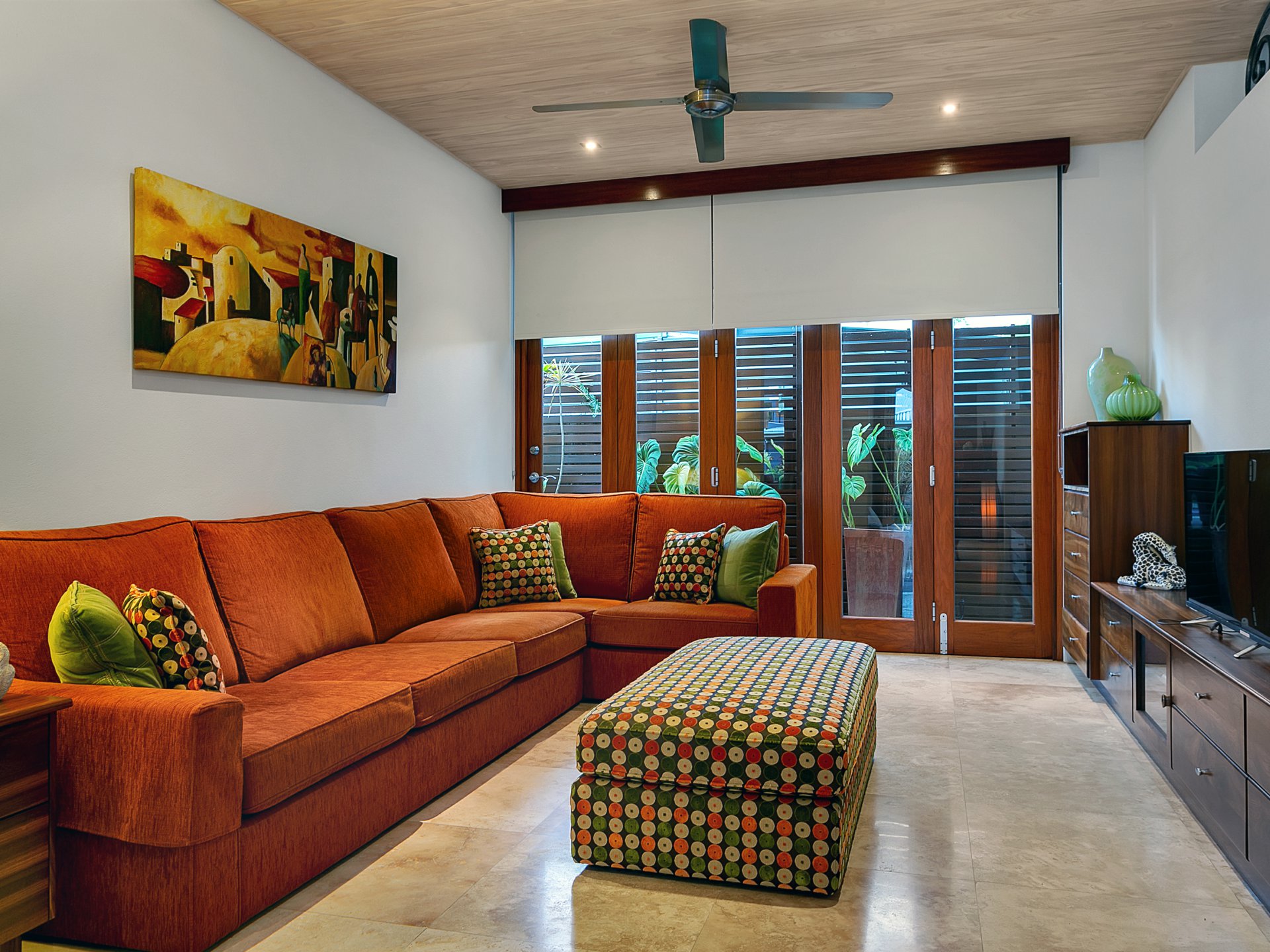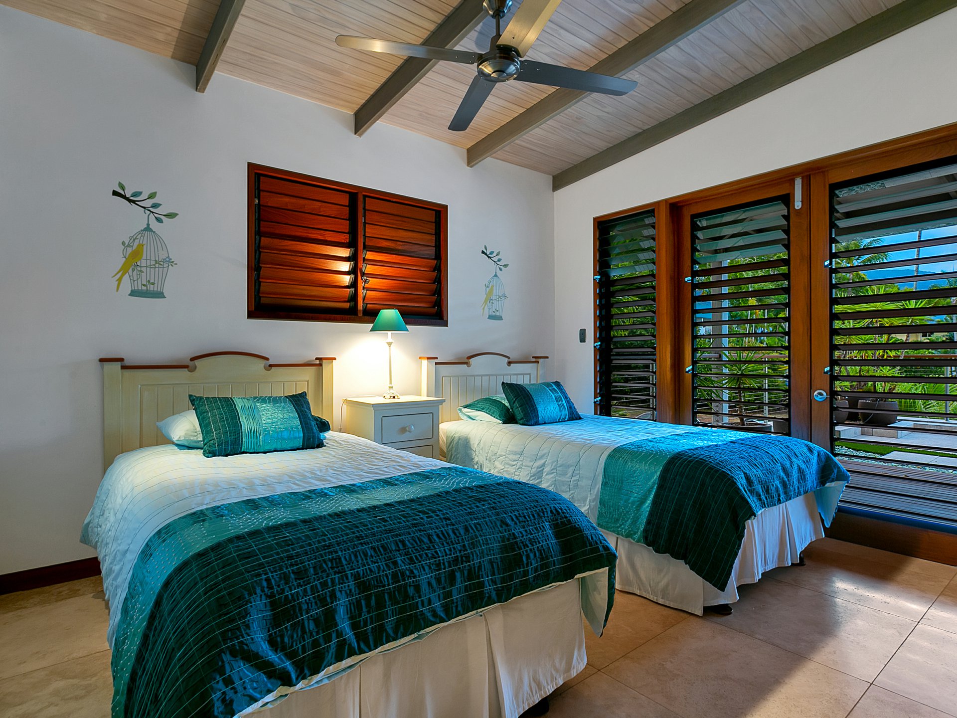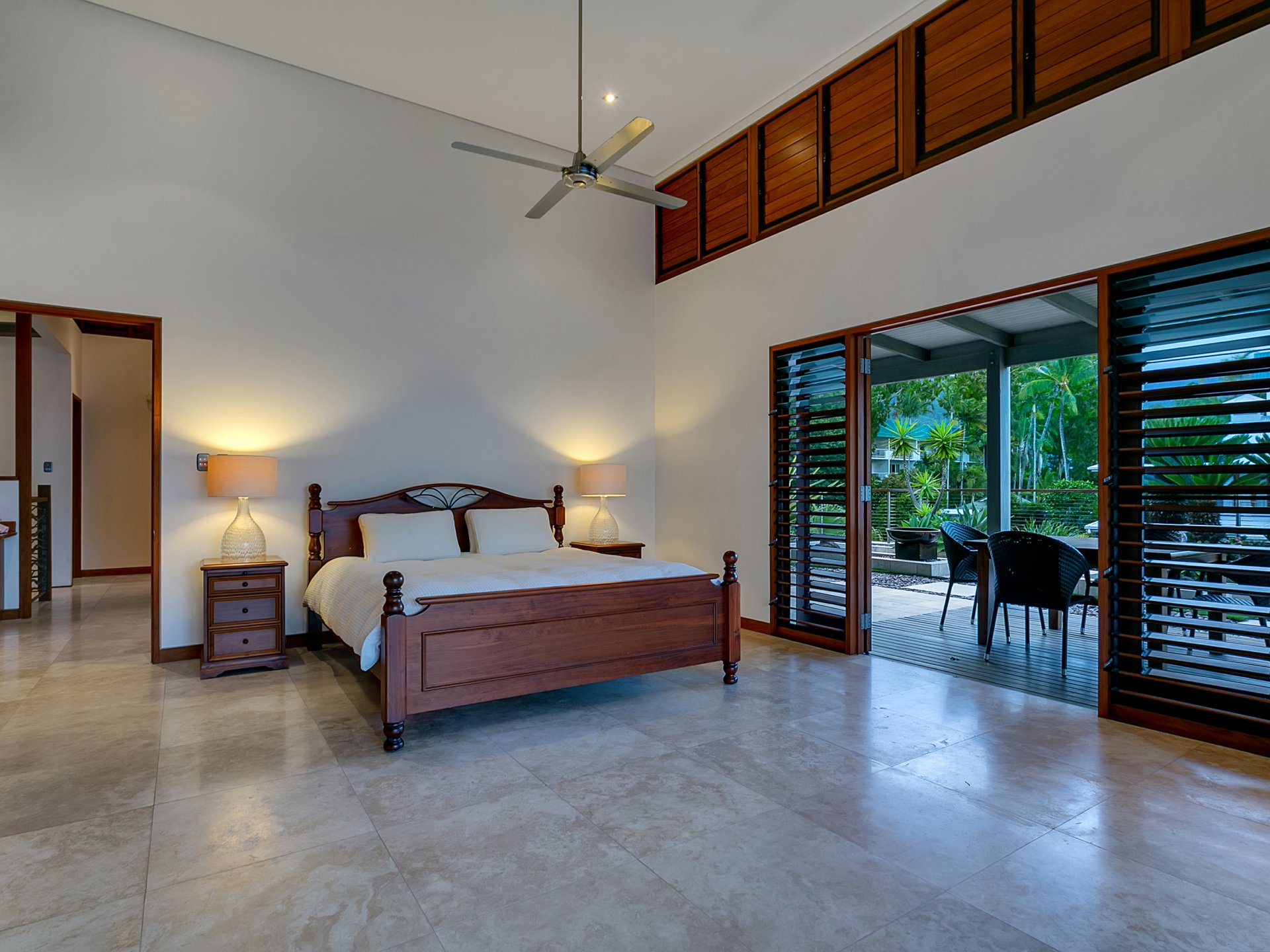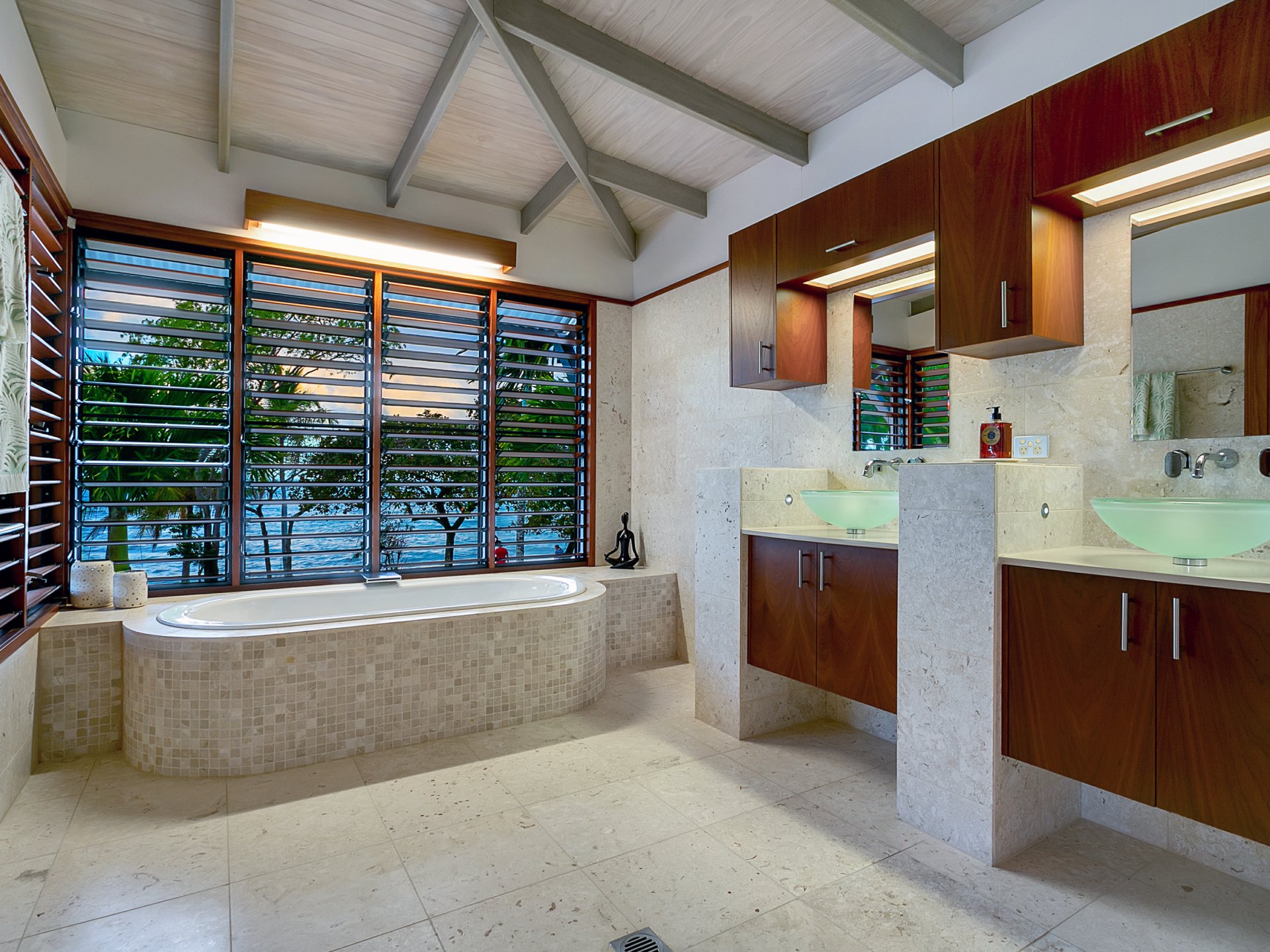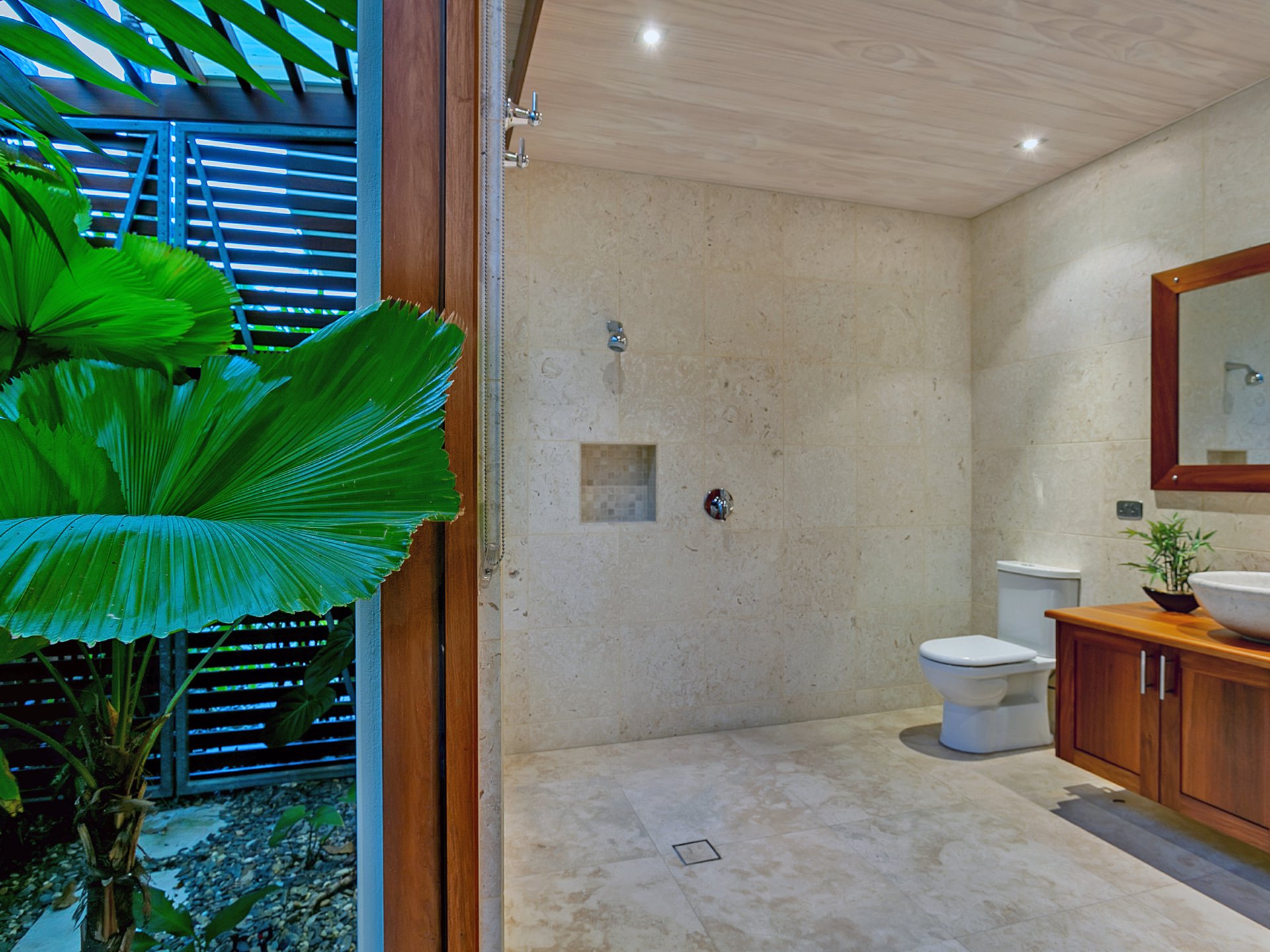 Upper Level - Huge Master Bedroom with an extra-large WIR - En-suite features his and hers Travertine vanity units with lighting to illuminated frosted glass basins which sit upon Caesarstone quartz benchtops, and a marble tiled bath surround with louvred windows which are not only a striking feature but they allow natural ventilation from the sea breeze - Additional 2 Bedrooms, 2 Bathrooms Upstairs, not to mention a Home office with a natural timber suspended desk - All bedrooms have direct access to the rooftop balcony and gardens - All bedrooms fully air-conditioned, timber doors and louvres - Roof top garden on a massive Travertine terrace - Whitewashed pine timber ceilings; all handpicked to ensure no knots - Ceilings with shadow line details