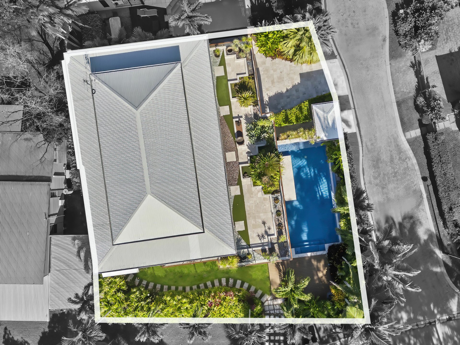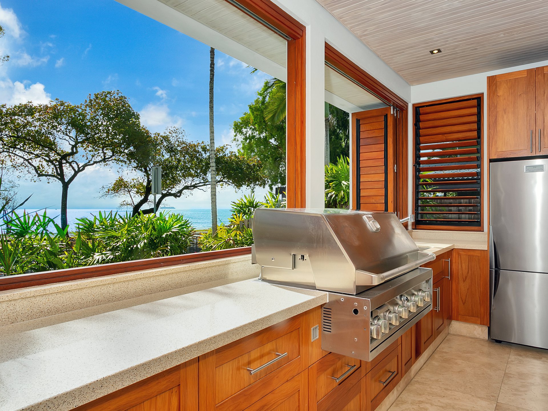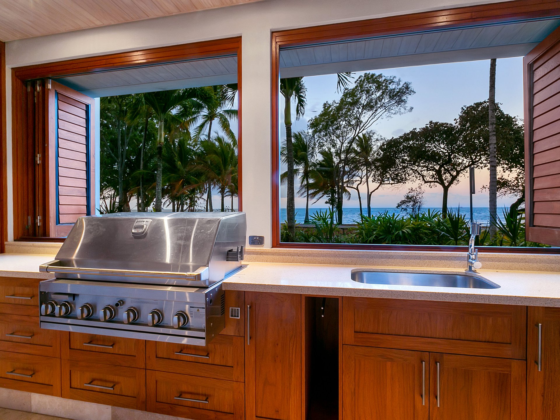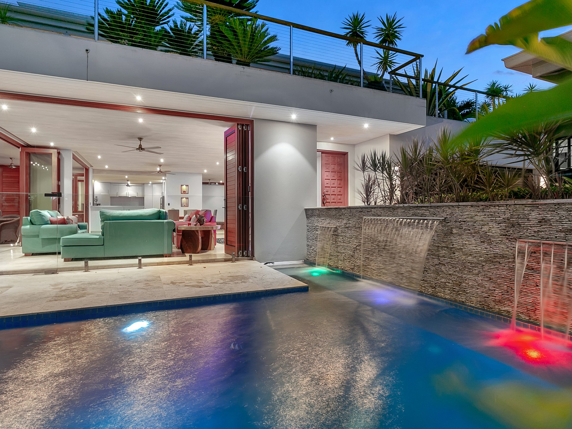 Ground Level - Enter through hand crafted, cast iron feature gates - Indoor water feature connecting to the outdoor swimming pool was designed to reflect the Great Barrier Reef and its many vibrant colours. Each Italian mosaic tile was hand cut by a local artist. - The outdoor, natural edge, fully tiled, heated swimming pool has 3 water spouts mounted onto a natural stone wall. - Indoor/Outdoor shower fully tiled using shell-stone - Stunning Kitchen with stone bench tops and island bench, the internal BBQ and 2nd kitchen area adjoining