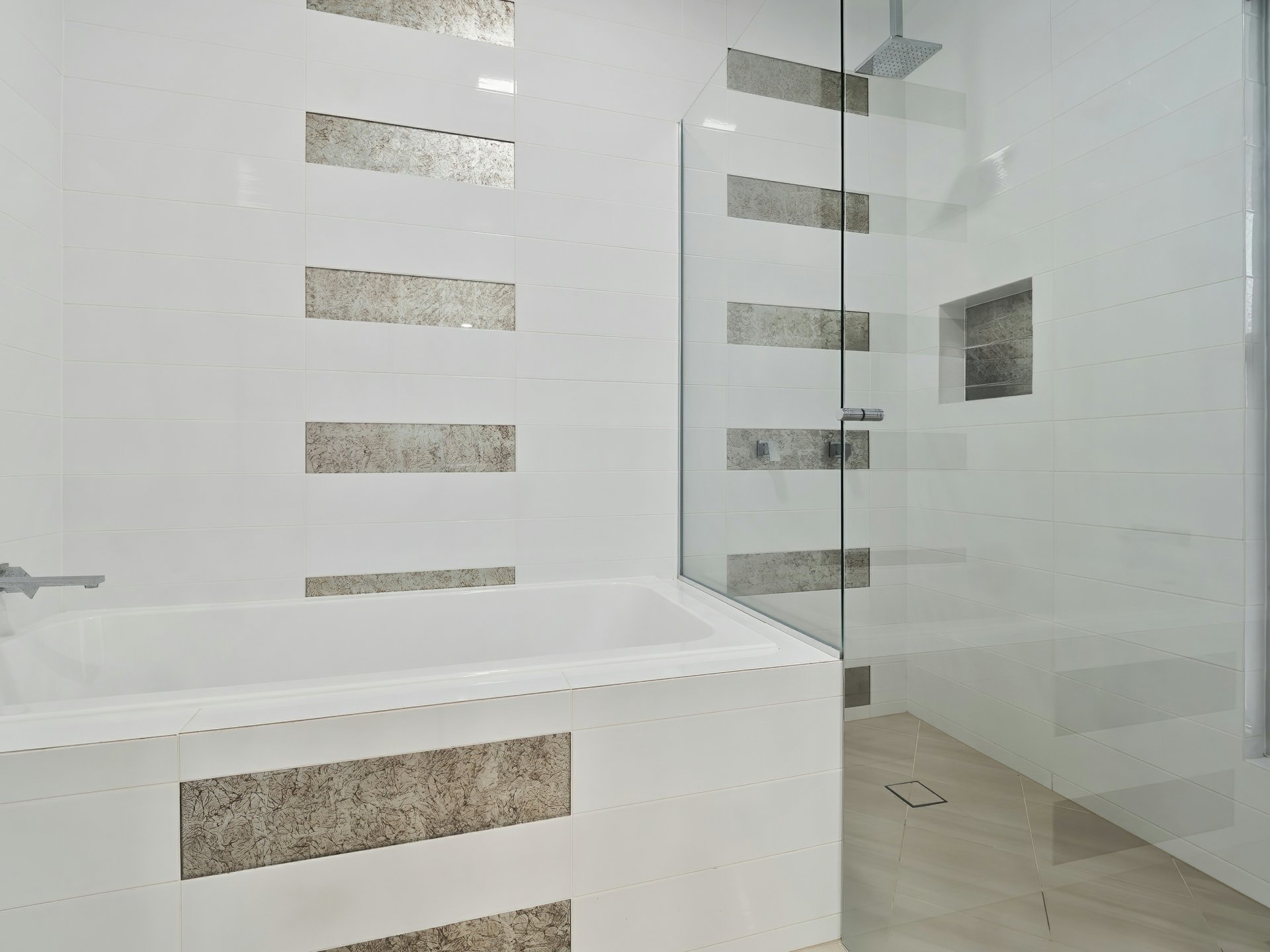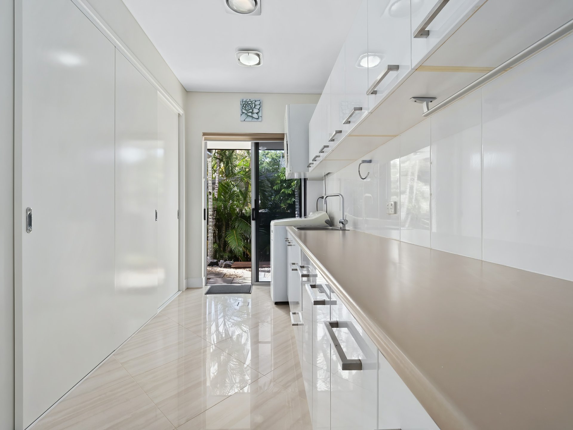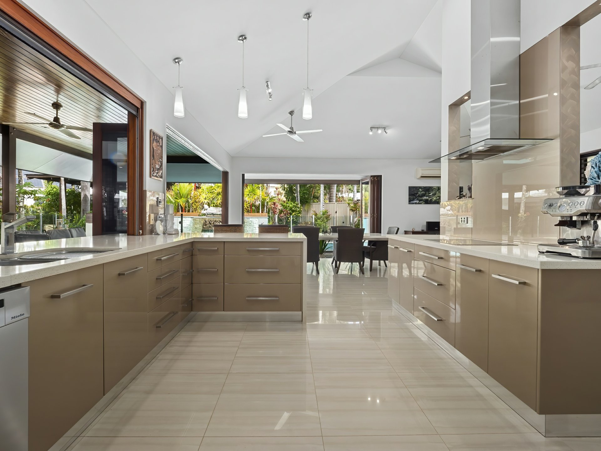 - Gourmet kitchen with butlers pantry, stone bench tops, glass splashbacks, modern stainless steel appliances, servery window out to patio