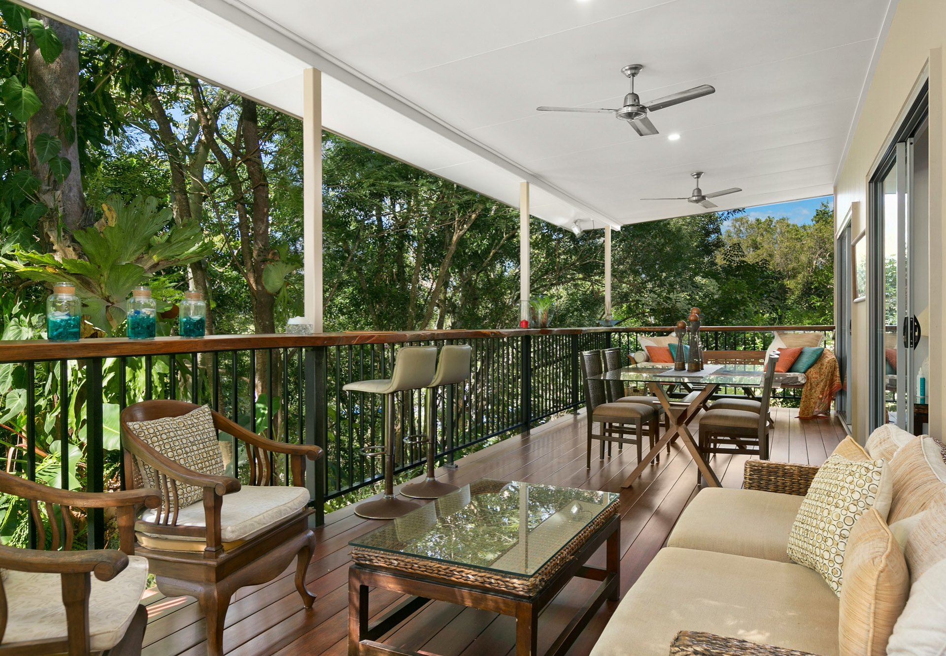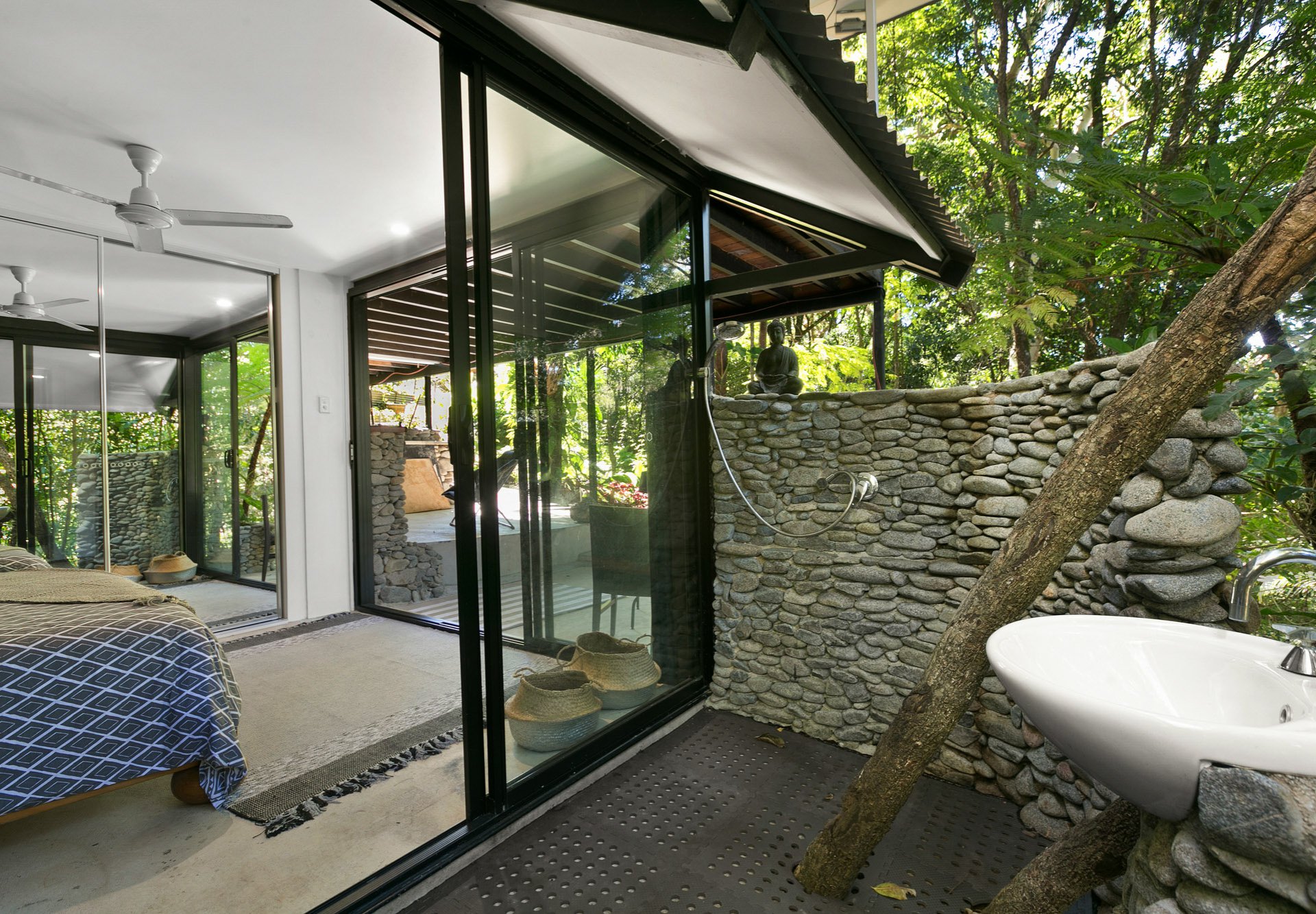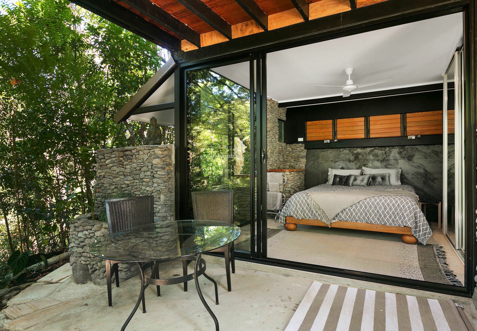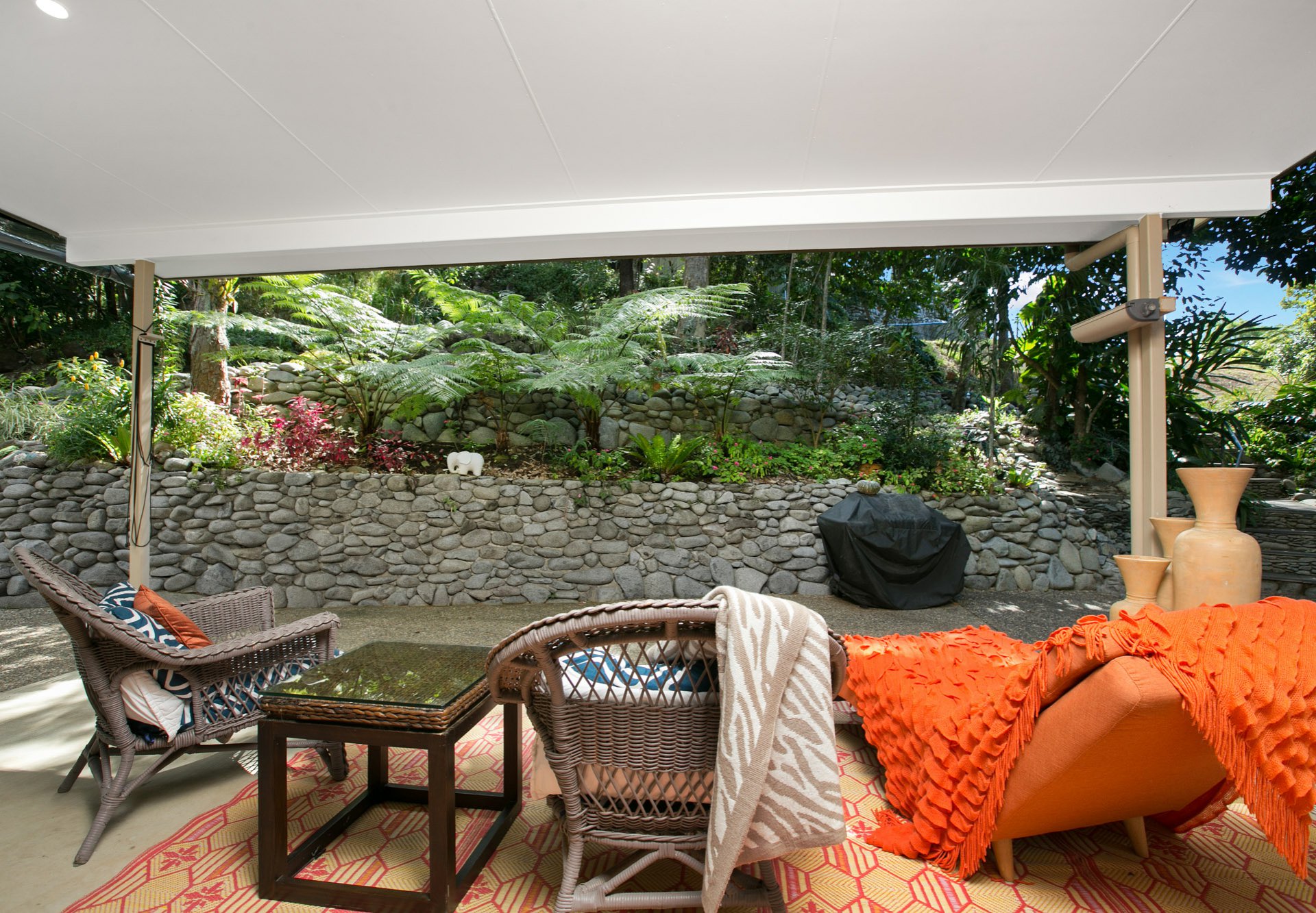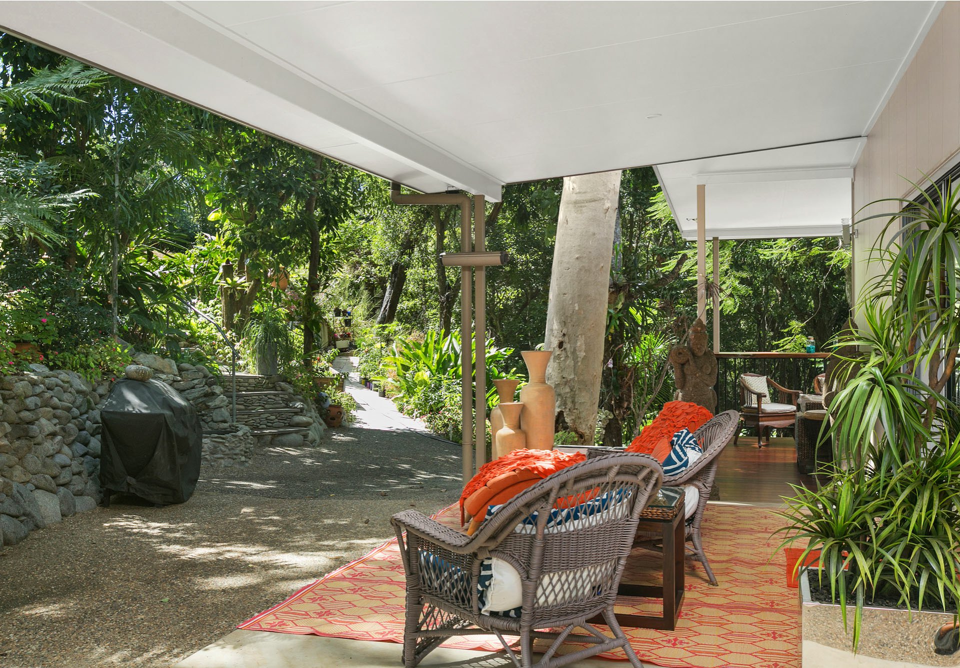 • Plus downstairs Activity/Utility room with outdoor bathroom • Parking for caravan, boat or motorhome • Seasonal creek • Beautifully landscaped established gardens • Exotic plants under a rainforest canopy • Walking paths and water features • Terraced rock walls • A cleared elevated building site for your dream home