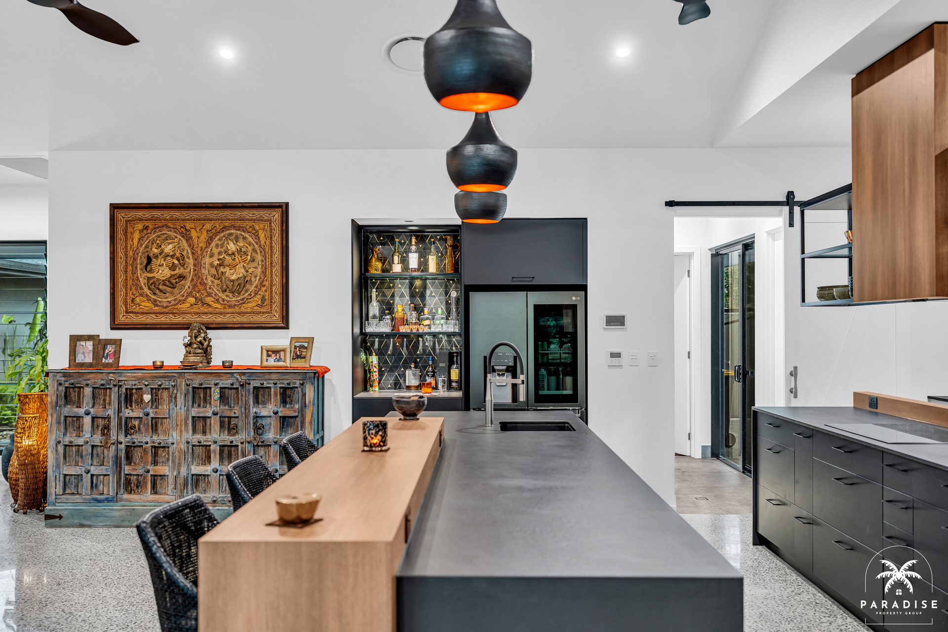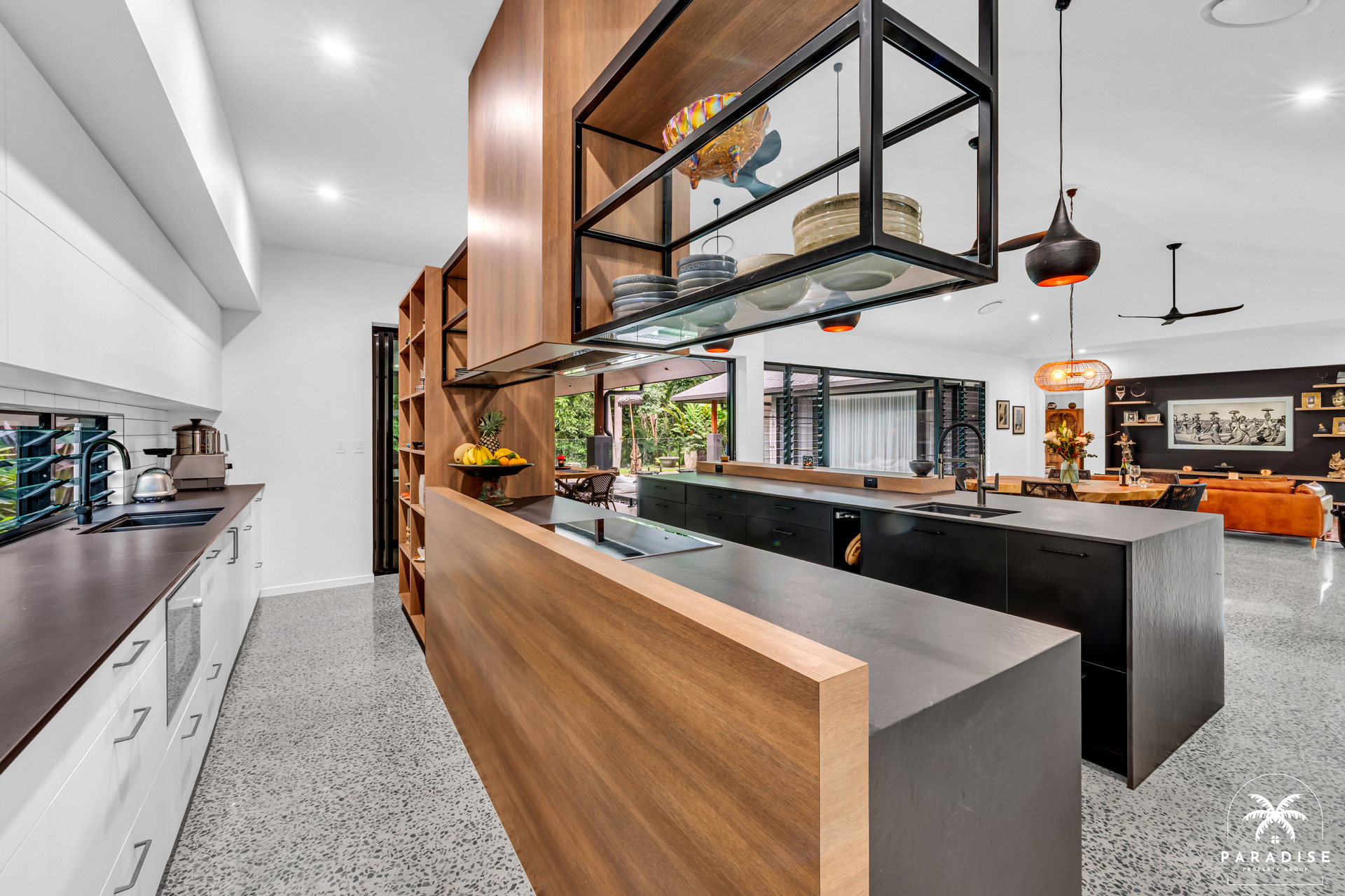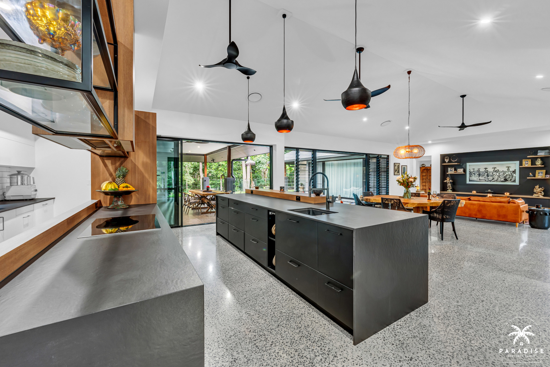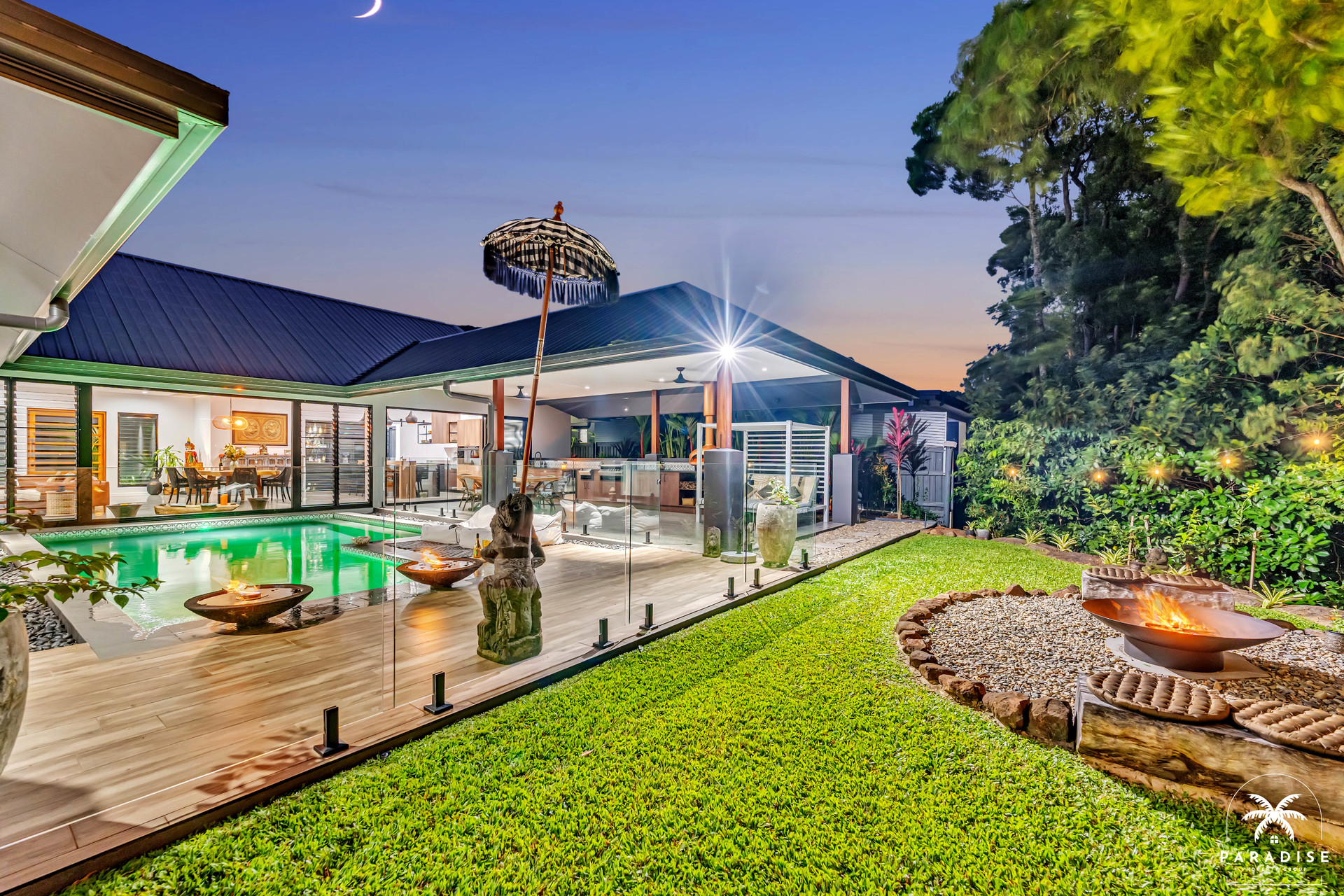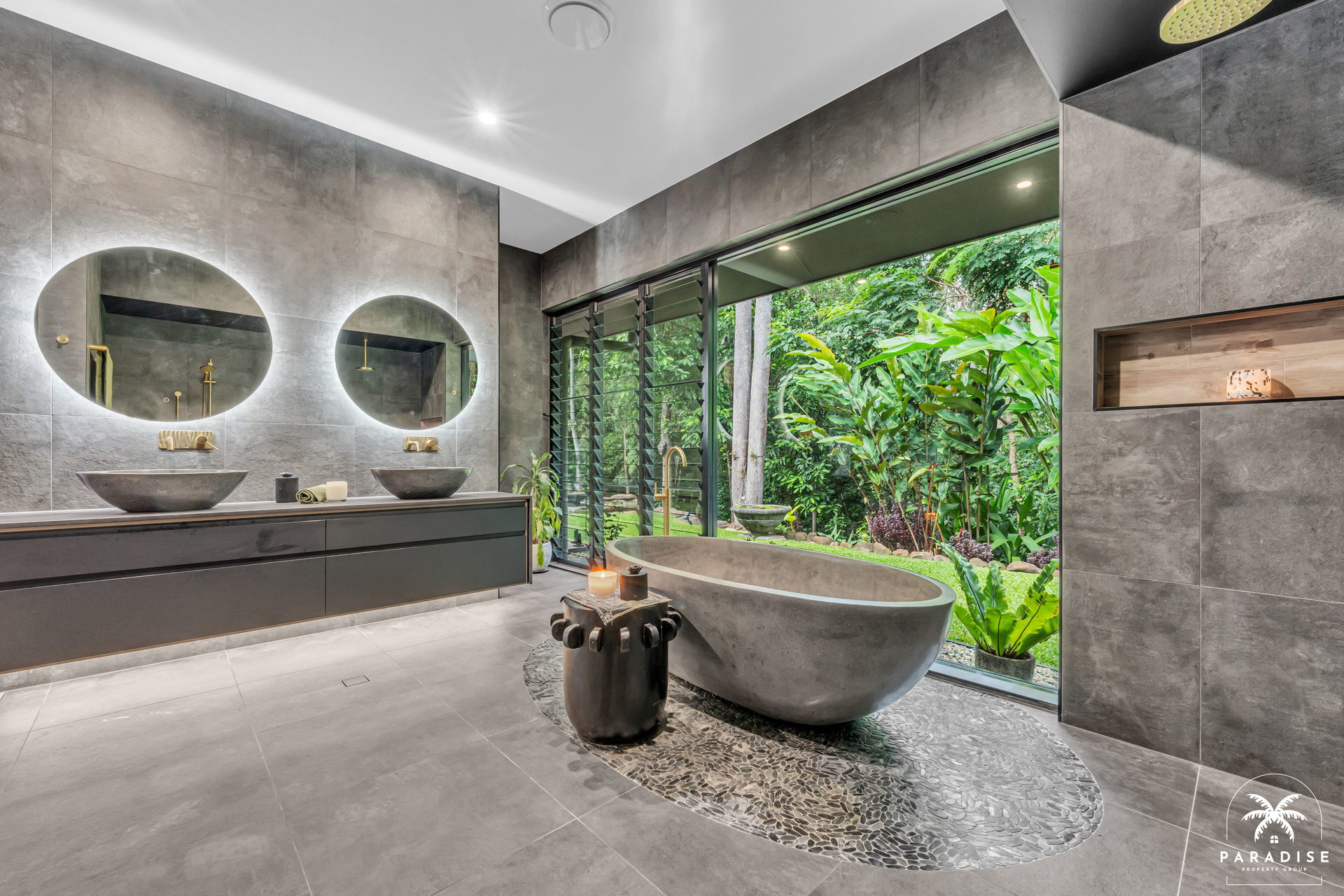 Luxury Boutique Retreat. - Cutting edge Architecture fused with traditional Balinese Design (Balay Vandyke). - Secure gatehouse guarded by Indonesian Warriors accessed through imported Antique Indian Temple Door, with electronic key access and guest intercom. - Private walled tropical courtyard with Asian-inspired gardens, water feature and winding oversized flagstone pavers that lead toward the bespoke New Guinea Rosewood Front Door. - Modern and Contemporary Layout with breathtaking scale. Boasting vaulted 5-meter-high ceilings, polished concrete floors, and walls of tinted glass, tropical louvres, and steel. - Cocktail, Whiskey & Wine Bar with integrated double fridge space, and Italian black marble and brass feature tiles. - Commercial Style Gourmet Kitchen with oversized Dekton stone benchtops, and floating steel shelves that lead through to professional butlers pantry. Complimented by high-end integrated, glass and Induction appliances. Endless rows of cabinetry, soft close drawers, spice drawers and storage, with feature window splash back and bonus Herb & Vegetable Garden (HIA Award-Winning Kitchen 2023). - Professional Outdoor Kitchen with 7metre long Dekton stone benchtops and cabinetry, integrated bar fridge, gas wok cooking, Ziegler and Brown self-cleaning 5 burner barbeque and Polito Giotto copper feature wood fire pizza oven. (HIA Award-Winning Outdoor Kitchen 2023). - Magnesium Resort Style Pool with rare Jade Green Glass Beaded pool light, spacious wood look ceramic tiled sun lounge area, outdoor rainwater shower, and unique dual stone water feature with integrated natural flame torches. - Luxurious Owners Suite overlooking and with direct access to the pool and secret garden. Polished Concrete Floors, high ceilings, deep walk-in dressing room, discreetly screened behind a wall of floor-to-ceiling sheer silk curtains to filter natural light. - Decadent Owners Bathroom with handmade Stone Bath, twin stone basins, wet room style double shower, hand-laid stone floors and tinted floor-to-ceiling picture window overlooking the rainforest. - Meditation Room overlooking private Zen Garden with manicured curved lawn, established Frangipani, and tranquil water feature. - An extensive Collection of handmade stone statues and unique water features have been sourced and imported from Indonesia surrounding the home and gardens. - Bespoke individual wrought iron and brass door furniture commissioned from local and overseas blacksmiths, with rare original handmade Naga Kanya door handles protecting the home. - Zoned Ducted Air conditioning with modern 3-blade aerodynamic energy-efficient ceiling fan, soft touch dimming LED lighting, remote controlled electric blinds, Crim Safe security and fly screens throughout. - Fully insulated energy efficient home, with high-grade 10kw Solar System installed complimented by oversized eaves to capture natural shade, reducing your carbon footprint whilst reducing costs. - Land size 1,255m2 with rainforest outlook, professionally landscaped, raised and retained with oversized boulders. Manicured lawns with low-maintenance tropical gardens all serviced by an automated watering system.