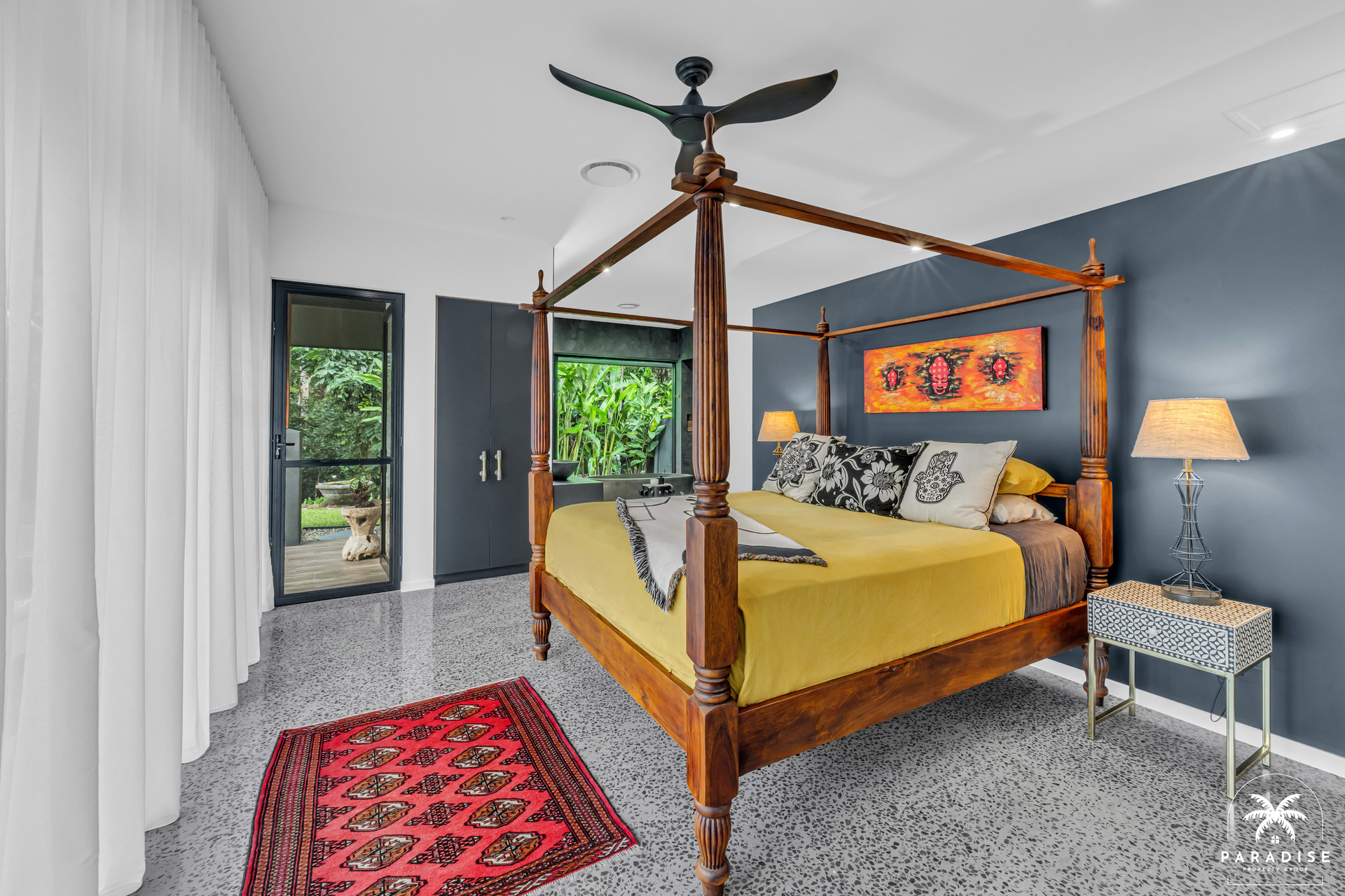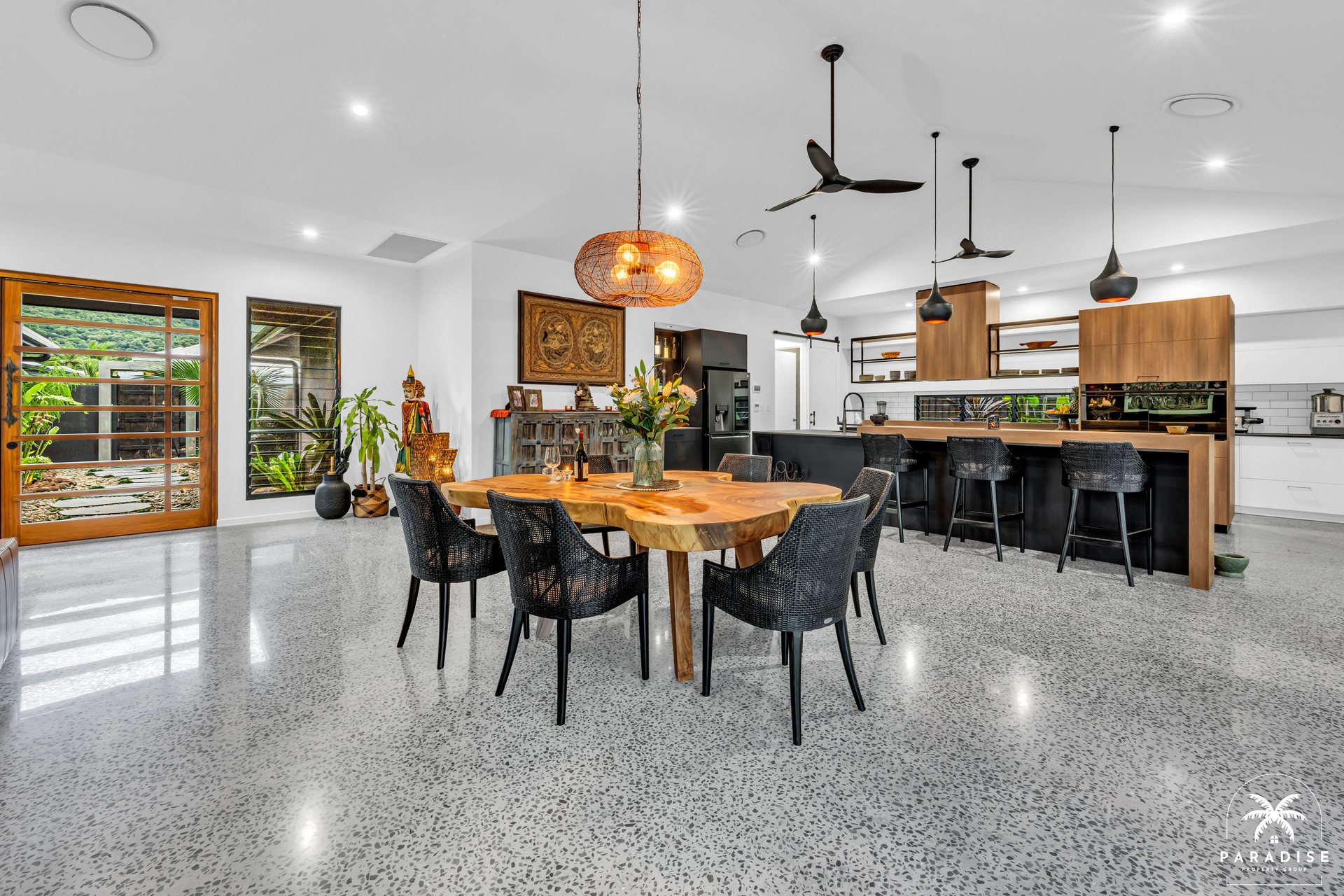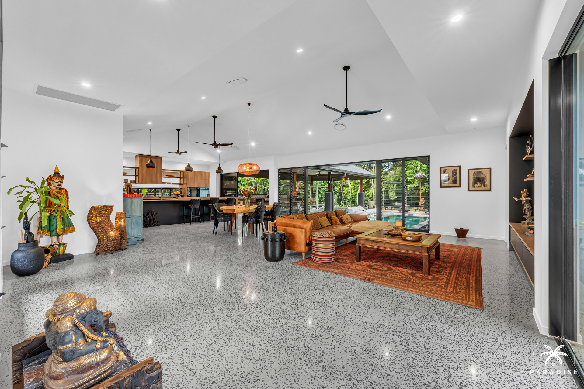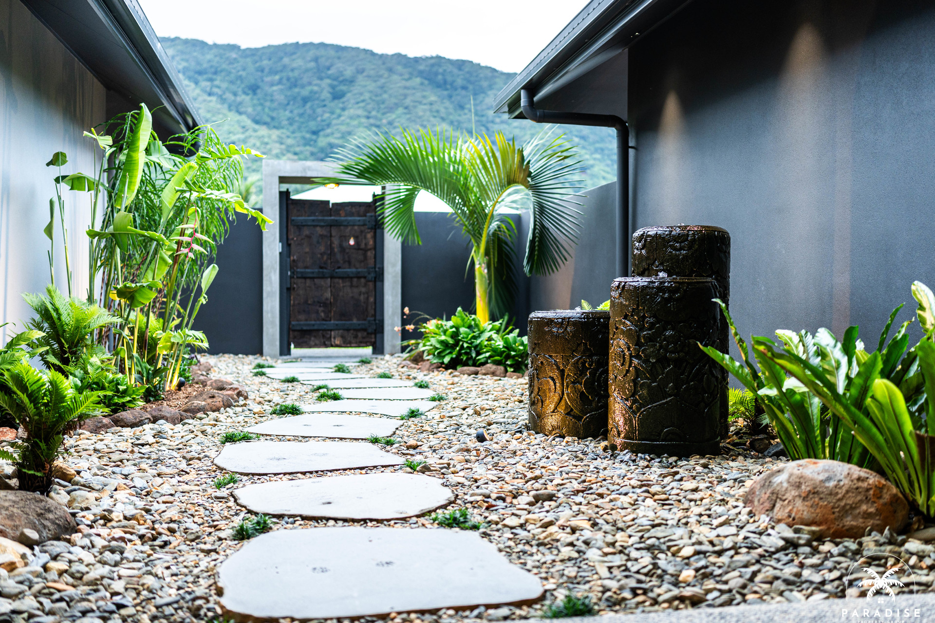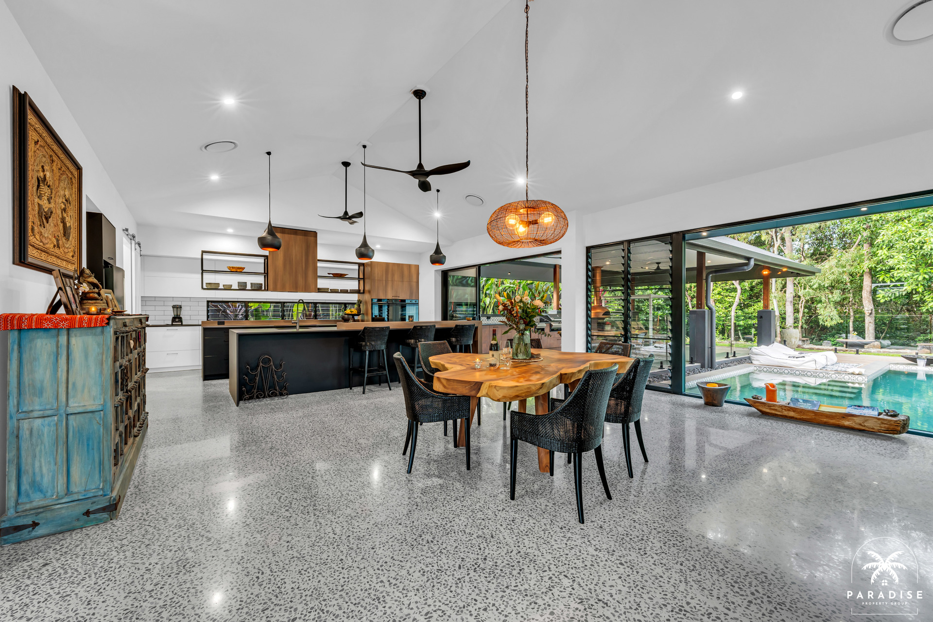 Luxury Boutique Retreat. - Cutting edge Architecture fused with traditional Balinese Design (Balay Vandyke). - Secure gatehouse guarded by Indonesian Warriors accessed through imported Antique Indian Temple Door, with electronic key access and guest intercom. - Private walled tropical courtyard with Asian-inspired gardens, water feature and winding oversized flagstone pavers that lead toward the bespoke New Guinea Rosewood Front Door. - Modern and Contemporary Layout with breathtaking scale. Boasting vaulted 5-meter-high ceilings, polished concrete floors, and walls of tinted glass, tropical louvres, and steel. - Cocktail, Whiskey & Wine Bar with integrated double fridge space, and Italian black marble and brass feature tiles. - Commercial Style Gourmet Kitchen with oversized Dekton stone benchtops, and floating steel shelves that lead through to professional butlers pantry. Complimented by high-end integrated, glass and Induction appliances. Endless rows of cabinetry, soft close drawers, spice drawers and storage, with feature window splash back and bonus Herb & Vegetable Garden (HIA Award-Winning Kitchen 2023). - Professional Outdoor Kitchen with 7metre long Dekton stone benchtops and cabinetry, integrated bar fridge, gas wok cooking, Ziegler and Brown self-cleaning 5 burner barbeque and Polito Giotto copper feature wood fire pizza oven. (HIA Award-Winning Outdoor Kitchen 2023). - Magnesium Resort Style Pool with rare Jade Green Glass Beaded pool light, spacious wood look ceramic tiled sun lounge area, outdoor rainwater shower, and unique dual stone water feature with integrated natural flame torches. - Luxurious Owners Suite overlooking and with direct access to the pool and secret garden. Polished Concrete Floors, high ceilings, deep walk-in dressing room, discreetly screened behind a wall of floor-to-ceiling sheer silk curtains to filter natural light. - Decadent Owners Bathroom with handmade Stone Bath, twin stone basins, wet room style double shower, hand-laid stone floors and tinted floor-to-ceiling picture window overlooking the rainforest. - Meditation Room overlooking private Zen Garden with manicured curved lawn, established Frangipani, and tranquil water feature. - An extensive Collection of handmade stone statues and unique water features have been sourced and imported from Indonesia surrounding the home and gardens. - Bespoke individual wrought iron and brass door furniture commissioned from local and overseas blacksmiths, with rare original handmade Naga Kanya door handles protecting the home. - Zoned Ducted Air conditioning with modern 3-blade aerodynamic energy-efficient ceiling fan, soft touch dimming LED lighting, remote controlled electric blinds, Crim Safe security and fly screens throughout. - Fully insulated energy efficient home, with high-grade 10kw Solar System installed complimented by oversized eaves to capture natural shade, reducing your carbon footprint whilst reducing costs. - Land size 1,255m2 with rainforest outlook, professionally landscaped, raised and retained with oversized boulders. Manicured lawns with low-maintenance tropical gardens all serviced by an automated watering system.