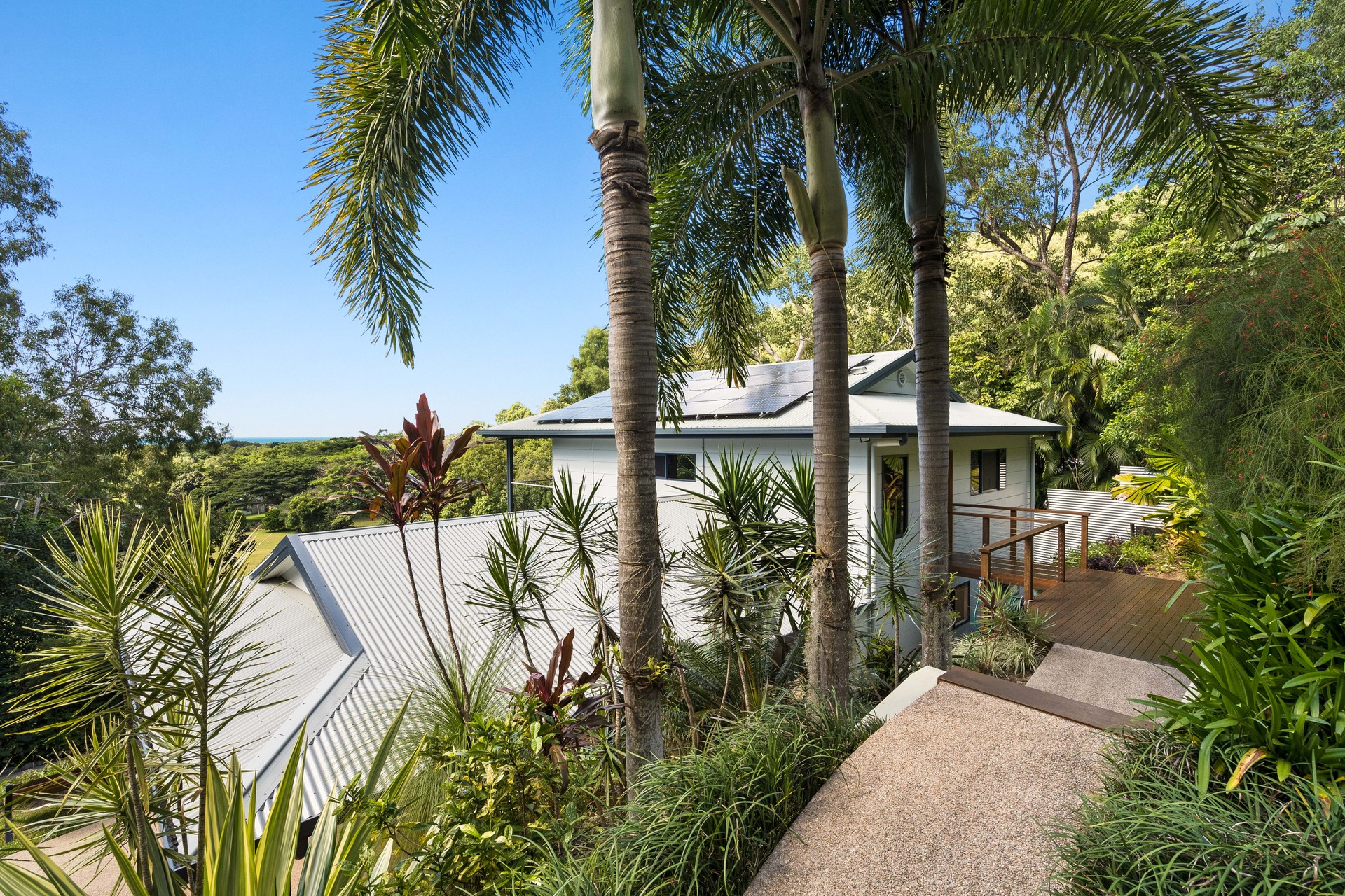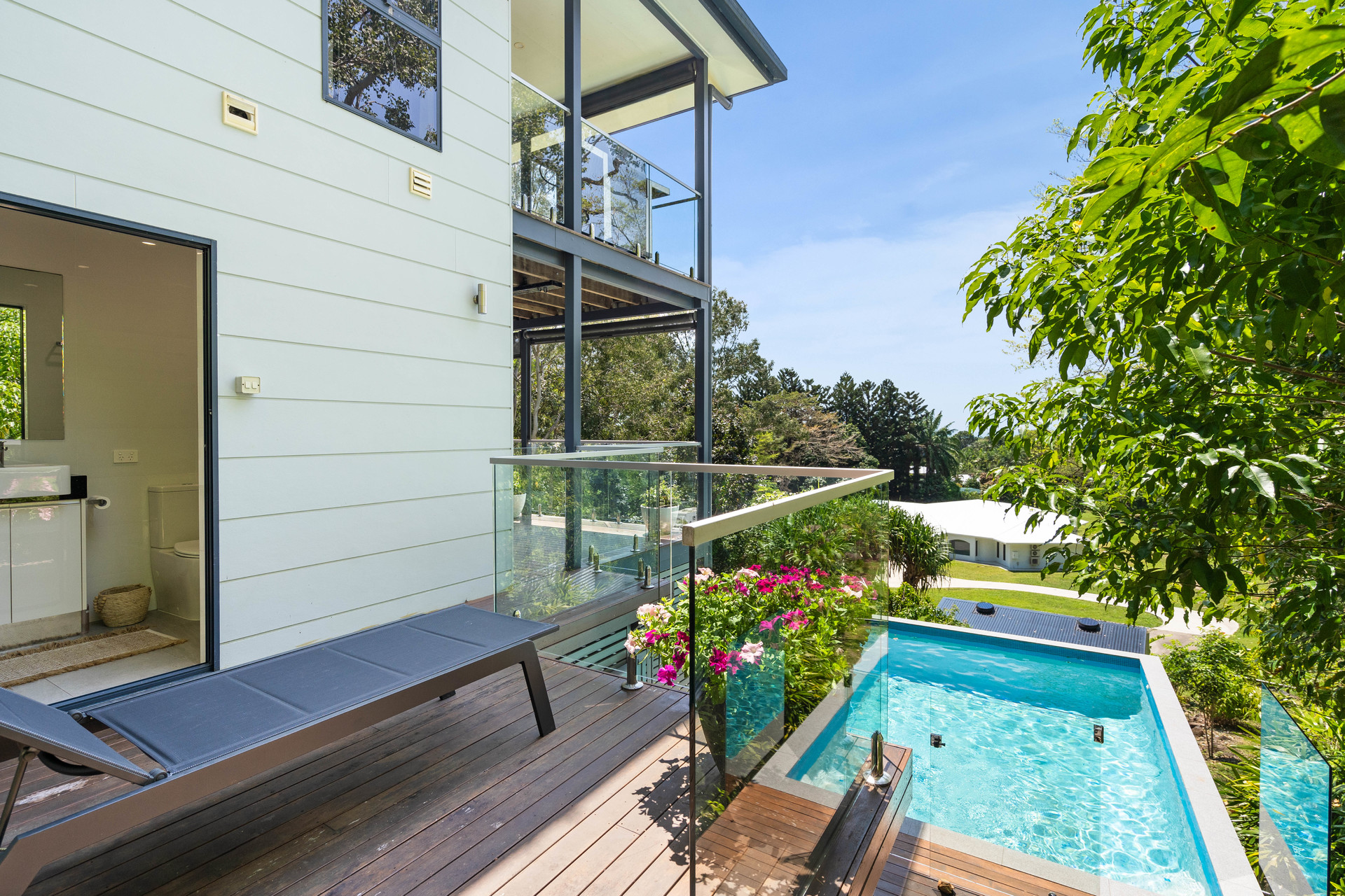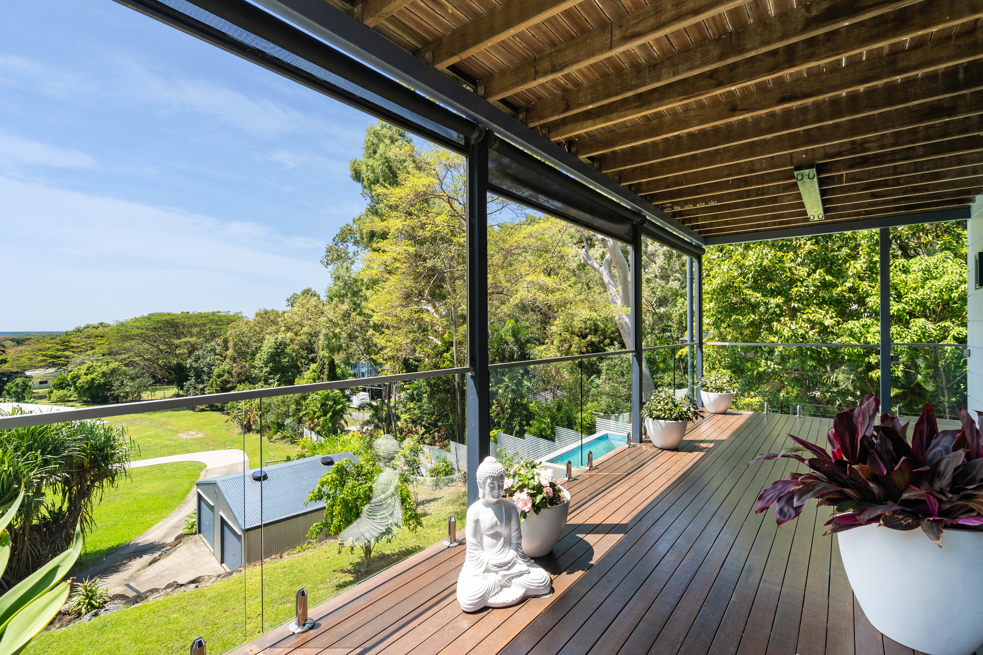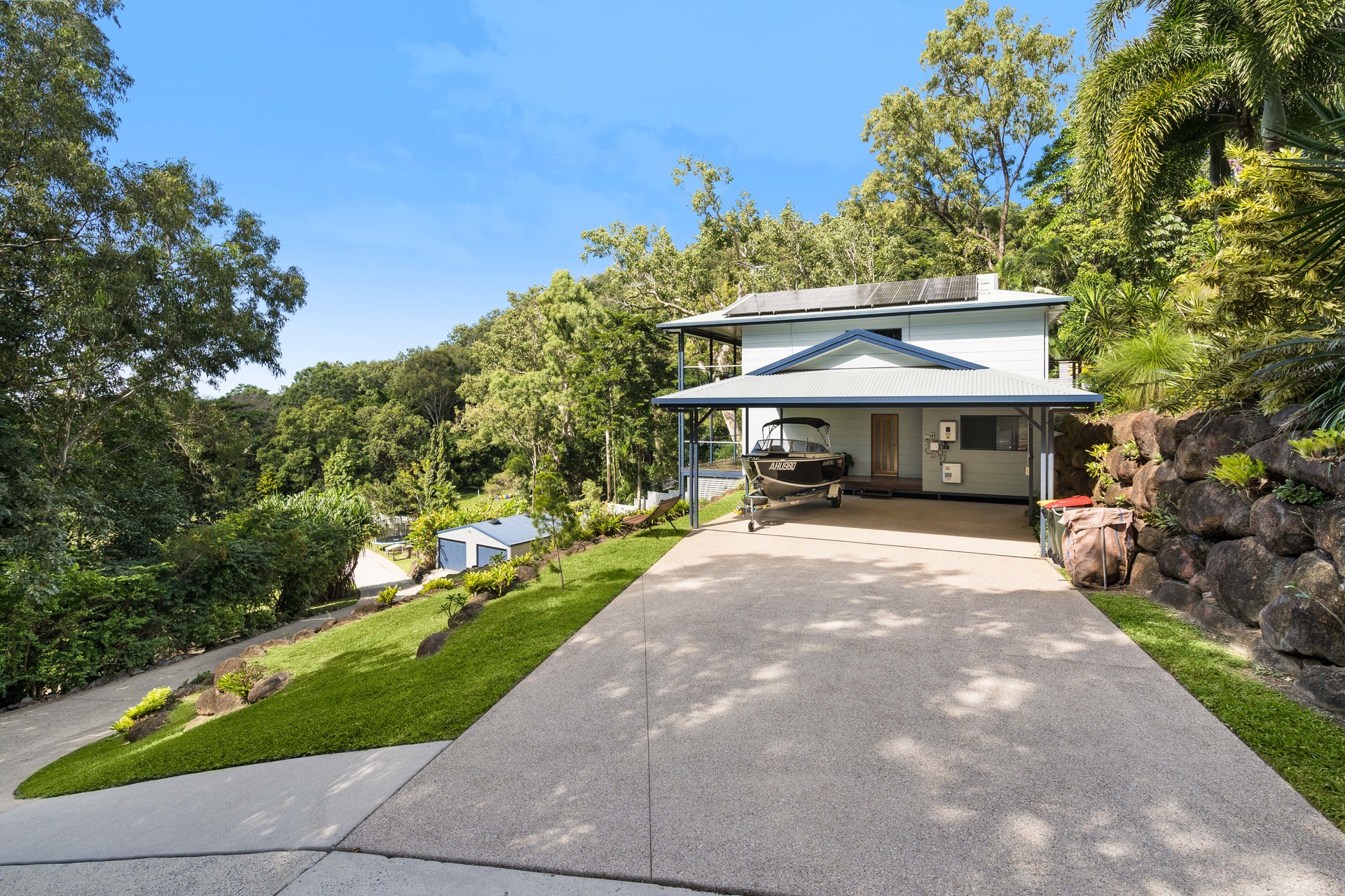 - 2,729m2 elevated block with useable land, minutes from the beach - Completely re-built in 2017 and presenting as new - Open-plan interiors with high ceilings and magnificent views - High-quality construction, elegant decor and polished timber floors - Superb indoor/outdoor living with two expansive balconies - Entertainer's kitchen with stone benches and SMEG appliances - Main bedroom with WIR, ensuite, and direct access to a private balcony - Delightful pool in sunny natural setting with ocean views - 6.6kw solar system and wired for generator - 42m2 shed, 2-bay carport and ample room for boat or campervan - Charming entry via a private bridge, framed by lush, landscaped gardens - Premium location at the end of a quiet cul-de-sac, offering absolute privacy