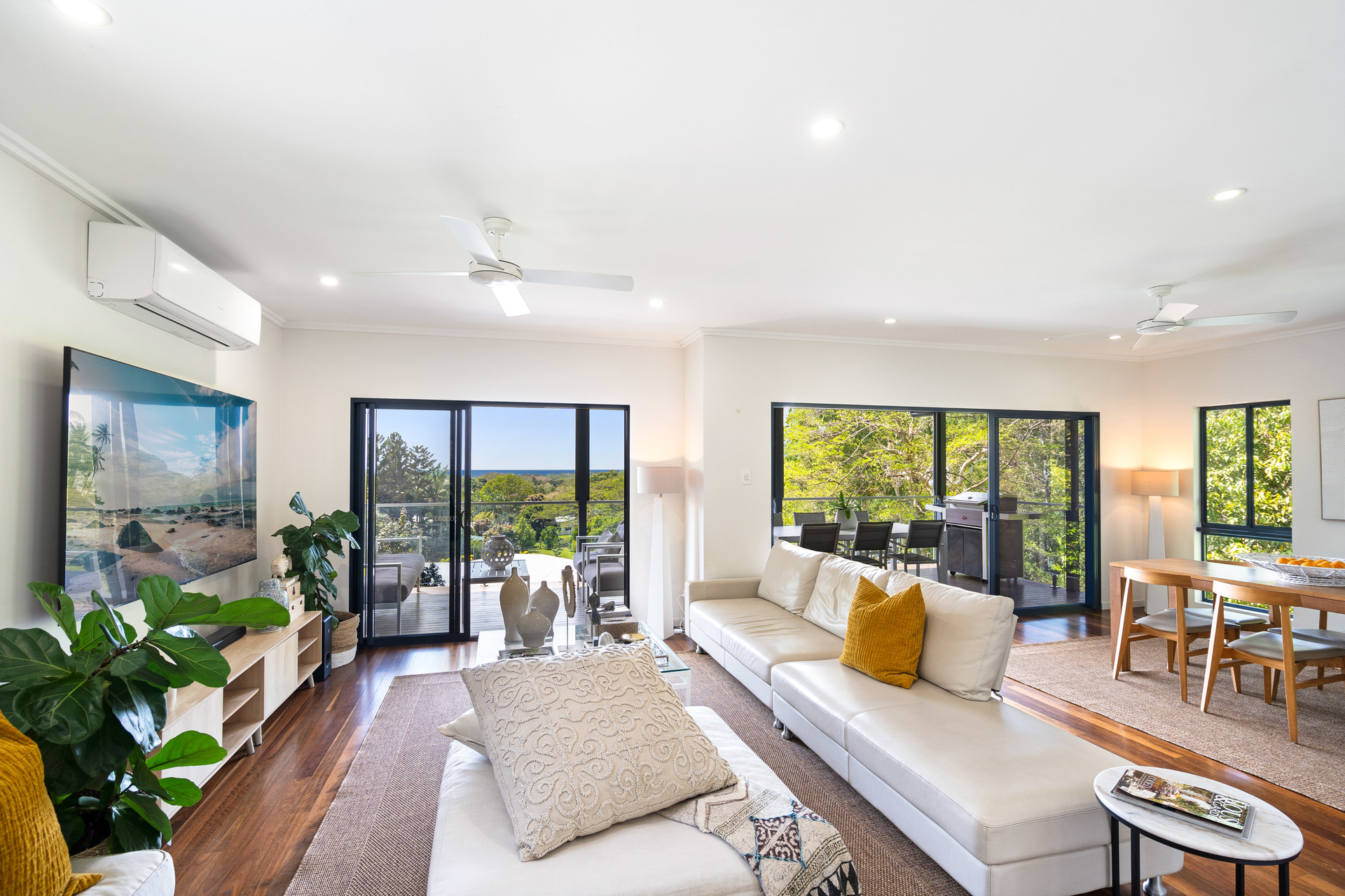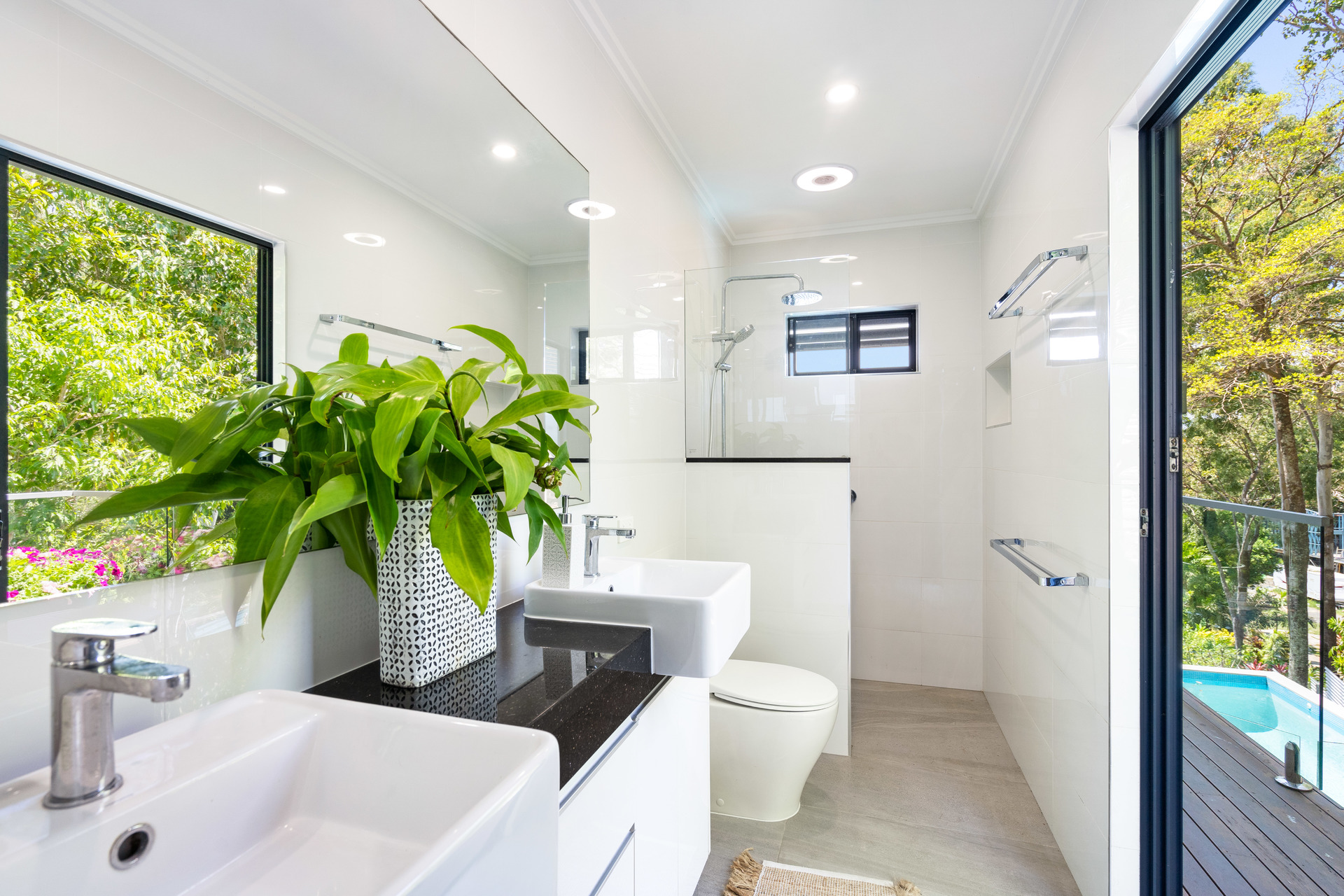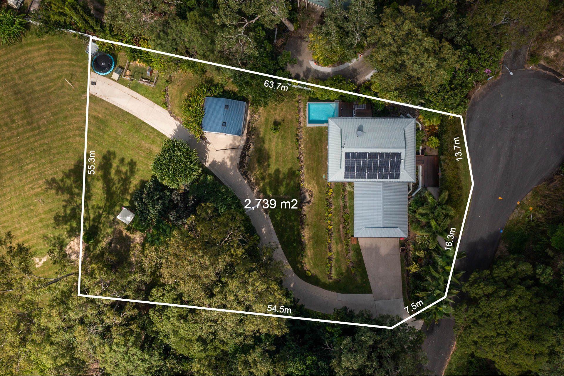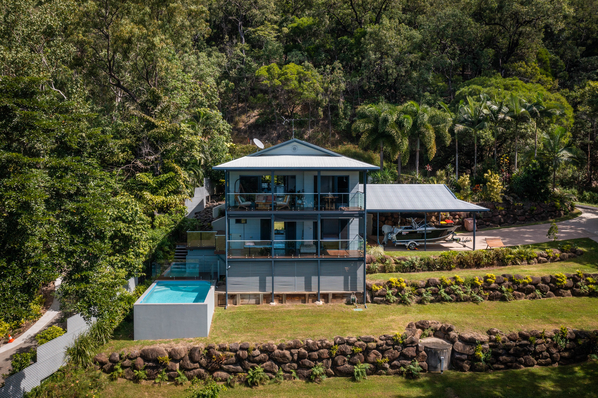 - 2,729m2 elevated block with useable land, minutes from the beach - Completely re-built in 2017 and presenting as new - Open-plan interiors with high ceilings and magnificent views - High-quality construction, elegant decor and polished timber floors - Superb indoor/outdoor living with two expansive balconies - Entertainer's kitchen with stone benches and SMEG appliances - Main bedroom with WIR, ensuite, and direct access to a private balcony - Delightful pool in sunny natural setting with ocean views - 6.6kw solar system and wired for generator - 42m2 shed, 2-bay carport and ample room for boat or campervan - Charming entry via a private bridge, framed by lush, landscaped gardens - Premium location at the end of a quiet cul-de-sac, offering absolute privacy
