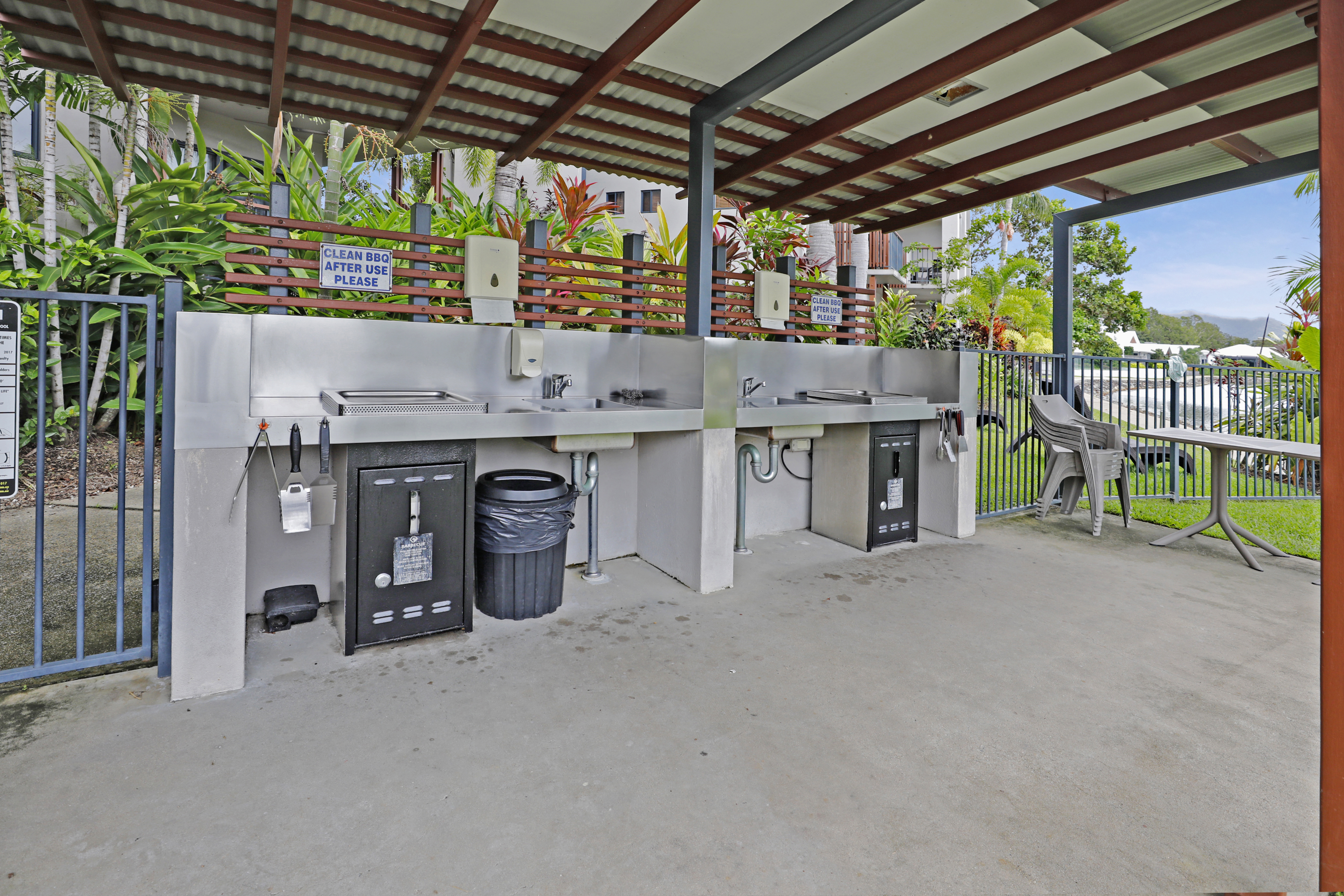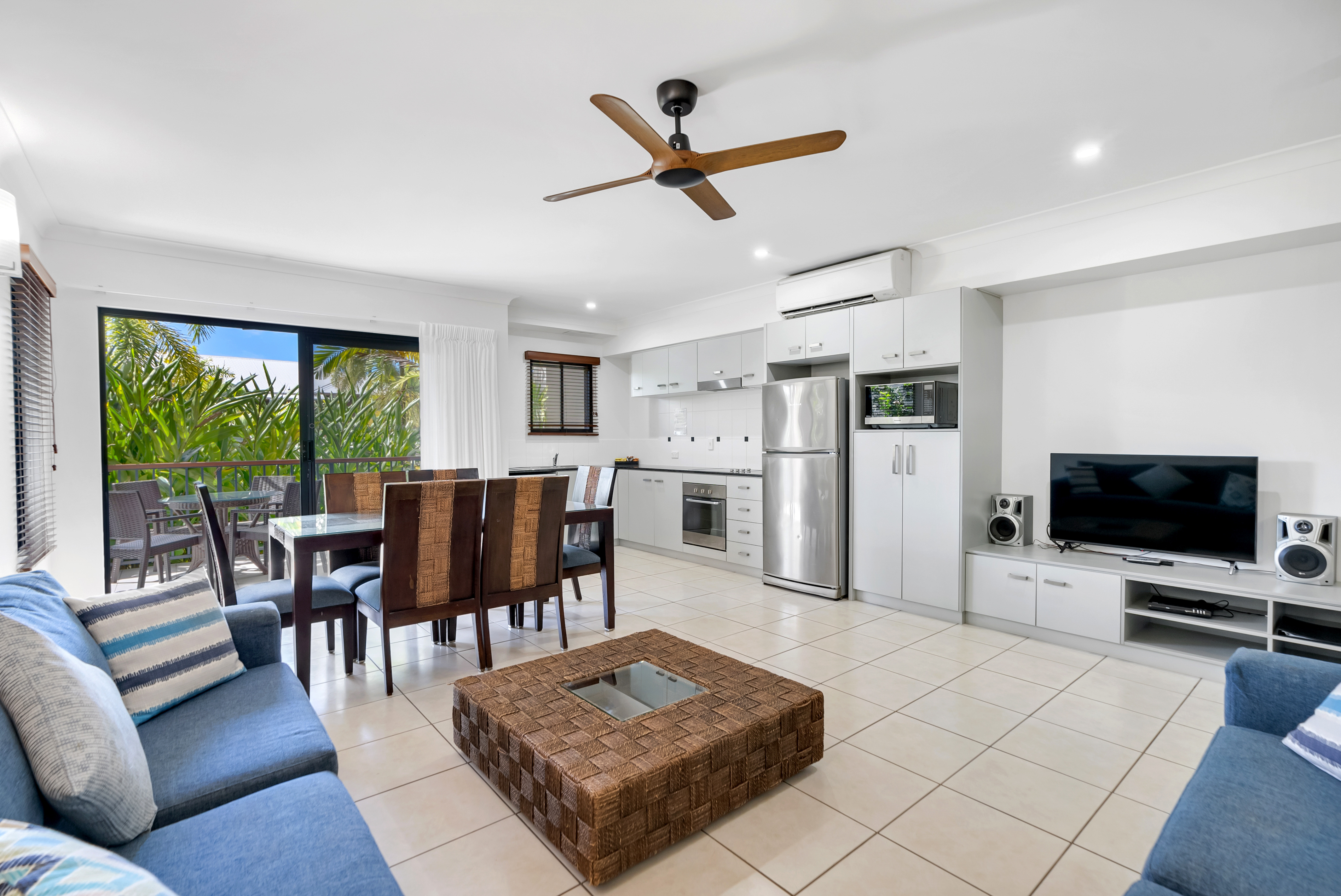 The apartment offers breath-taking views of a serene lagoon and a rainforest back drop. The beautiful coastline of Trinity Beach is just a couple of minutes walk away, where you will find a great selection of restaurants, cafes and bars serving a variety of international cuisine, beers and wine, whilst also enjoying the amazing views over the palm tree lined white sandy beach.