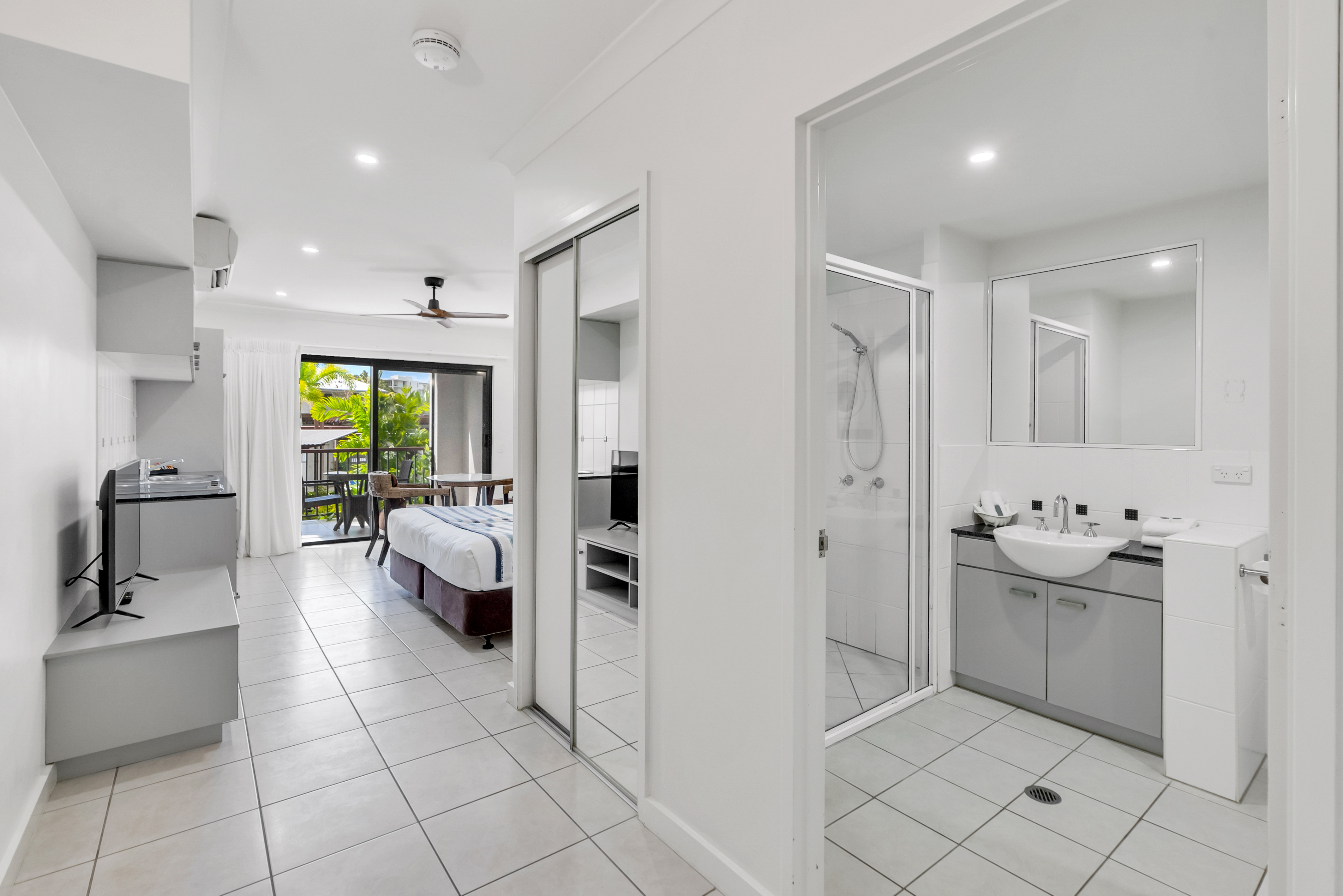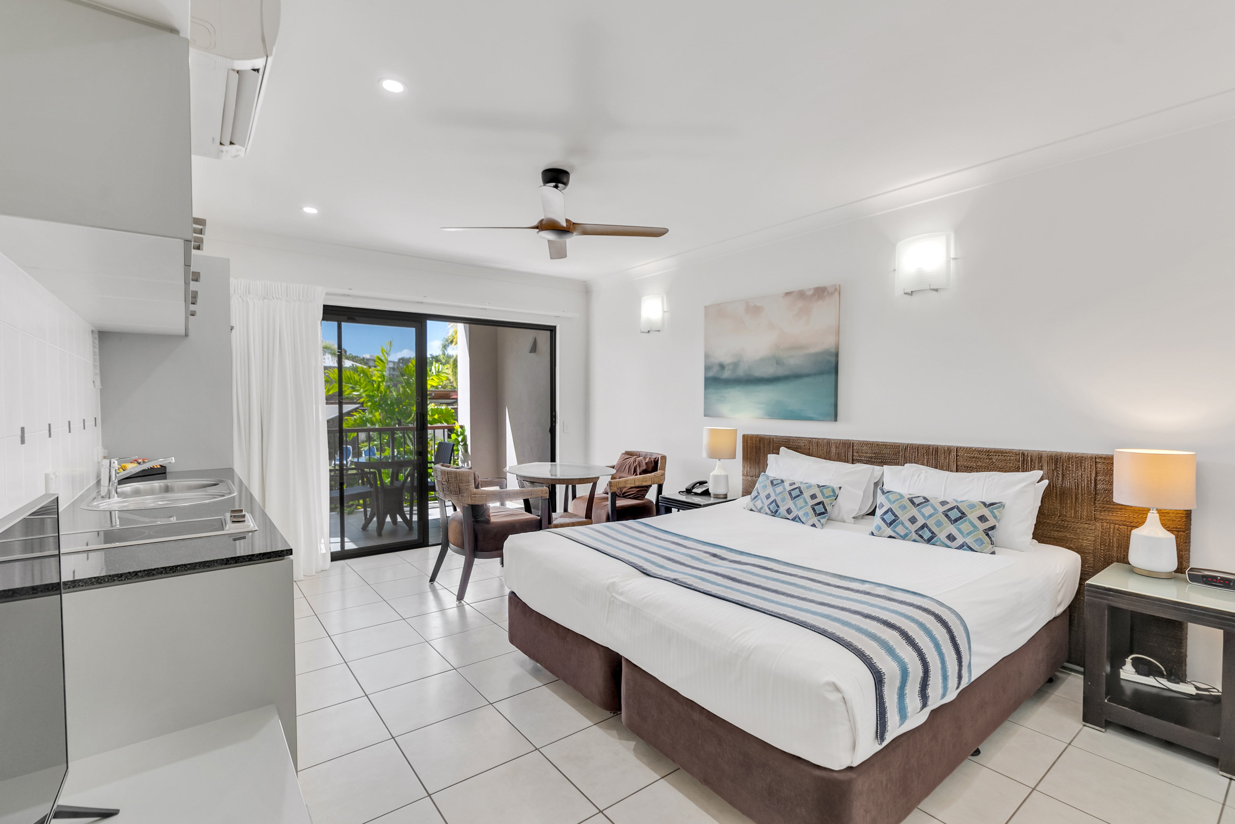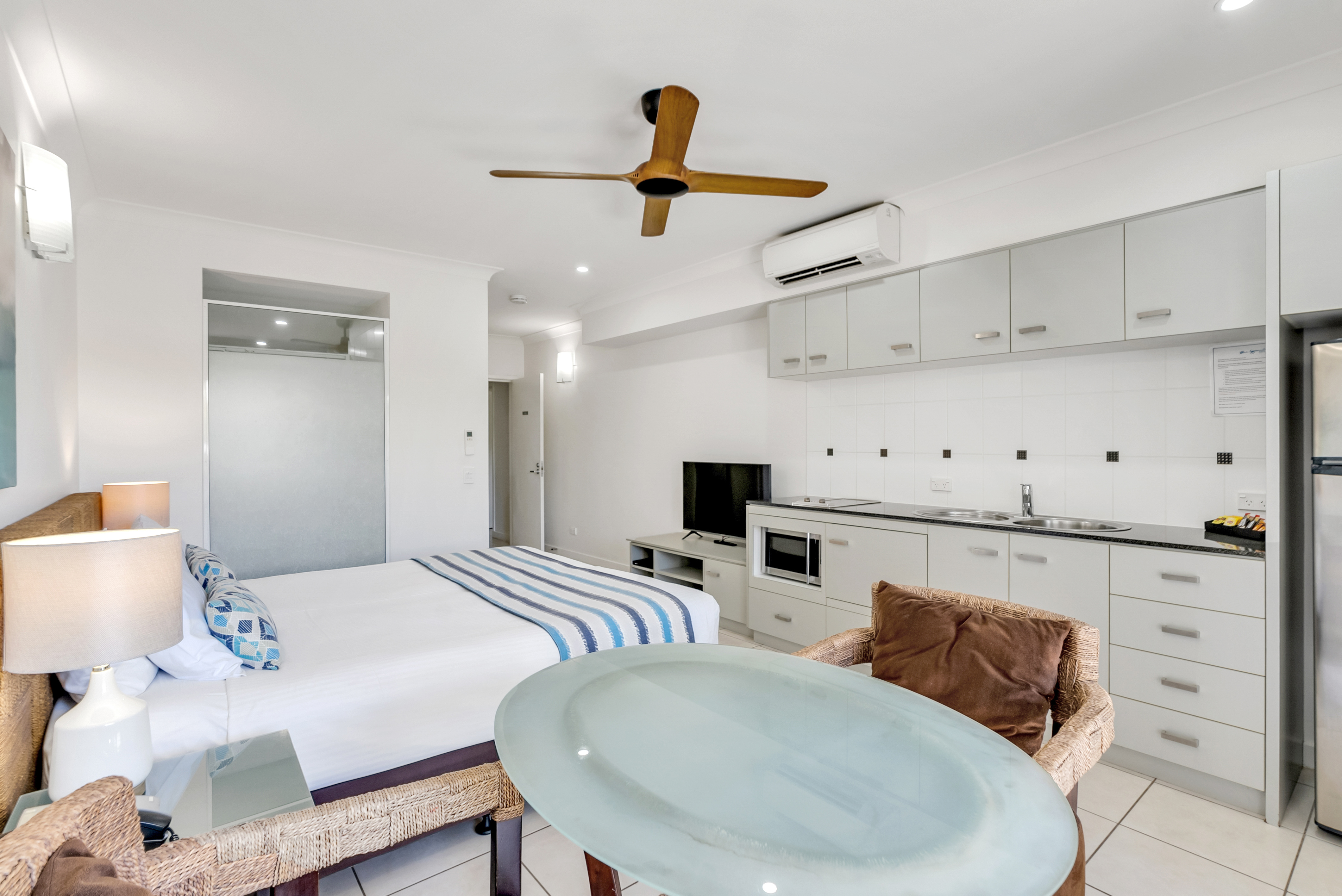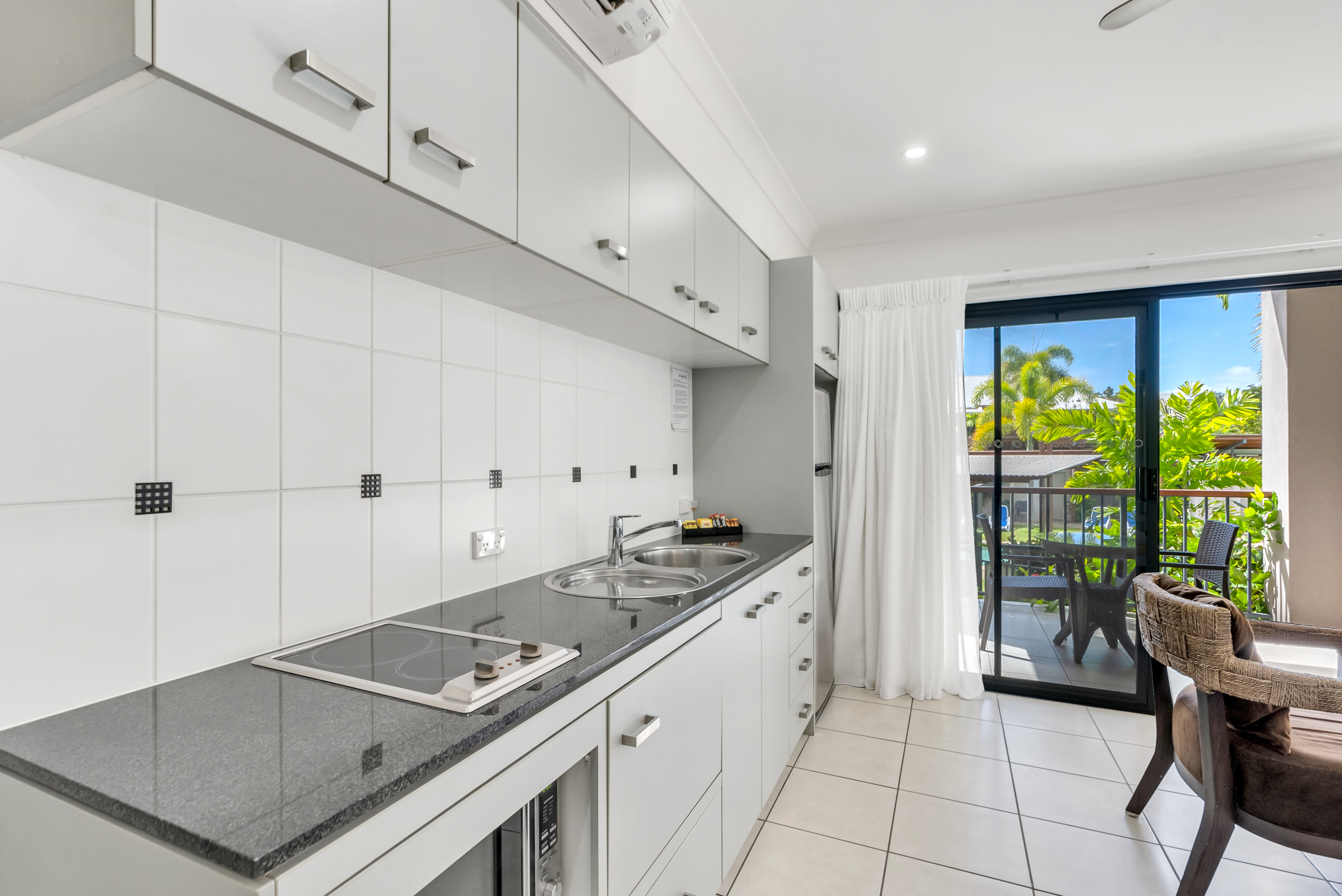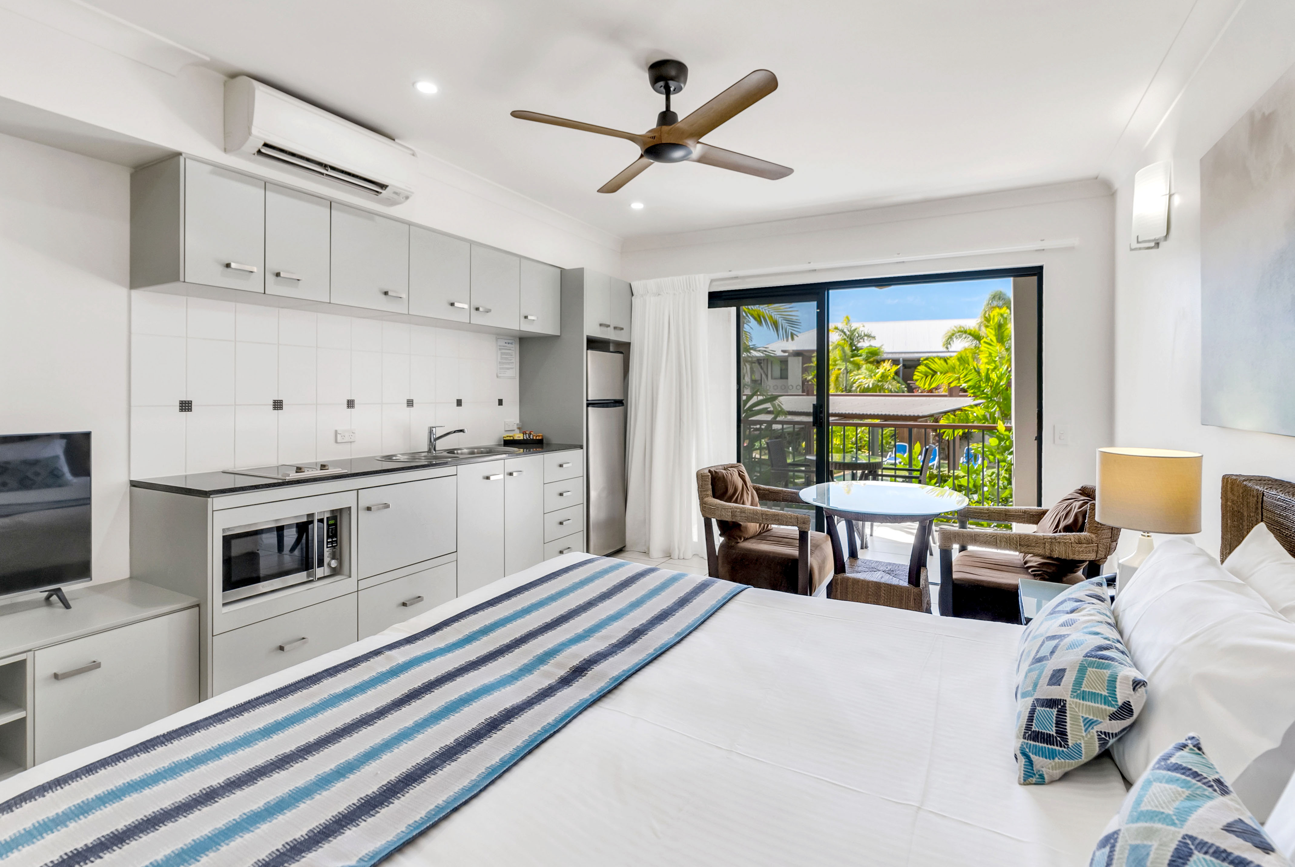 Apartment B: • Self contained studio style. • Kitchenette. • Balcony overlooking the pool. • Laundry.