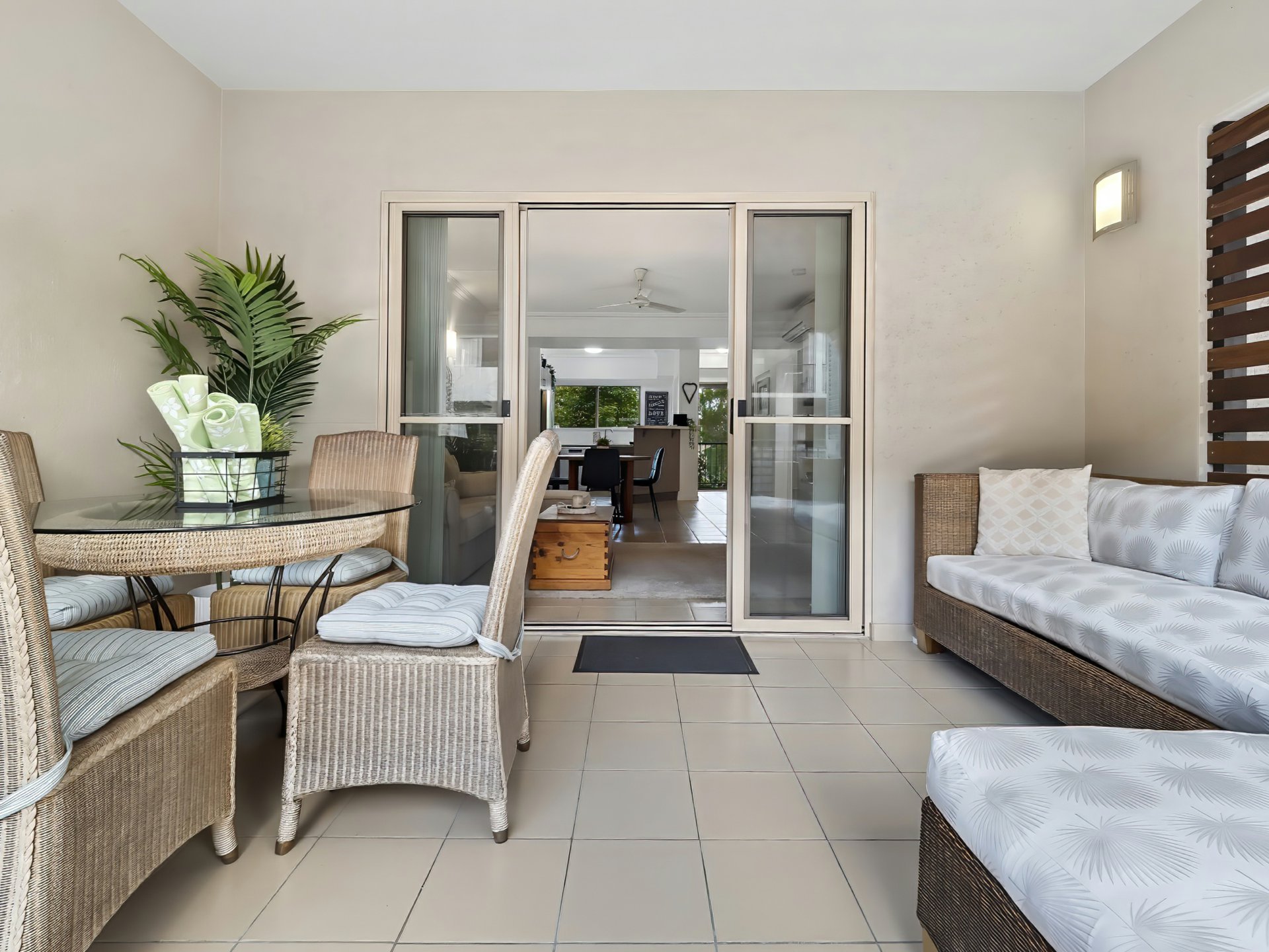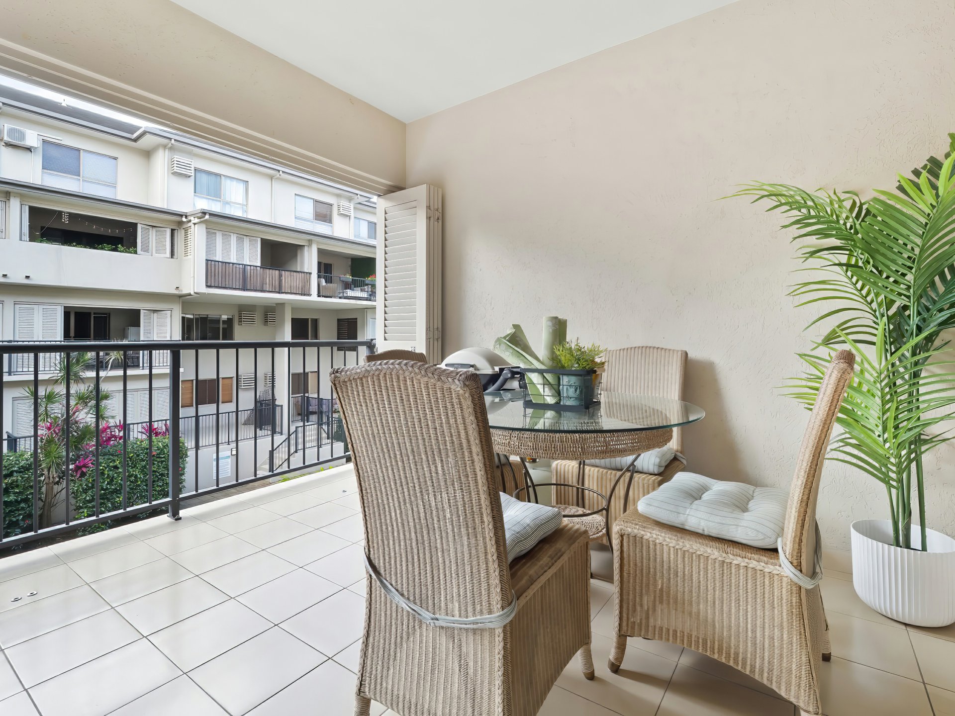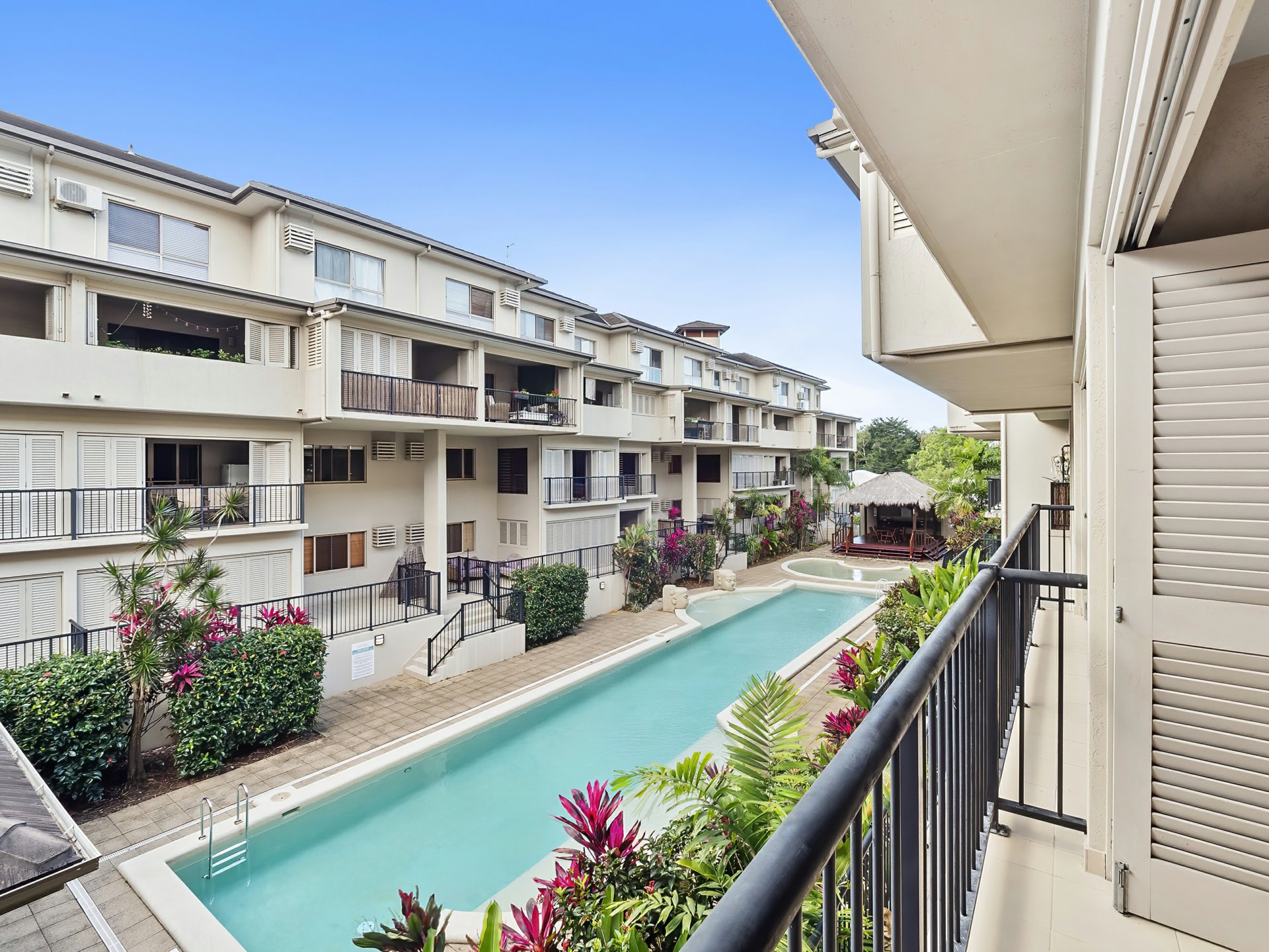 The generous sized balcony with privacy louvers and a sliding door looking over the pool,