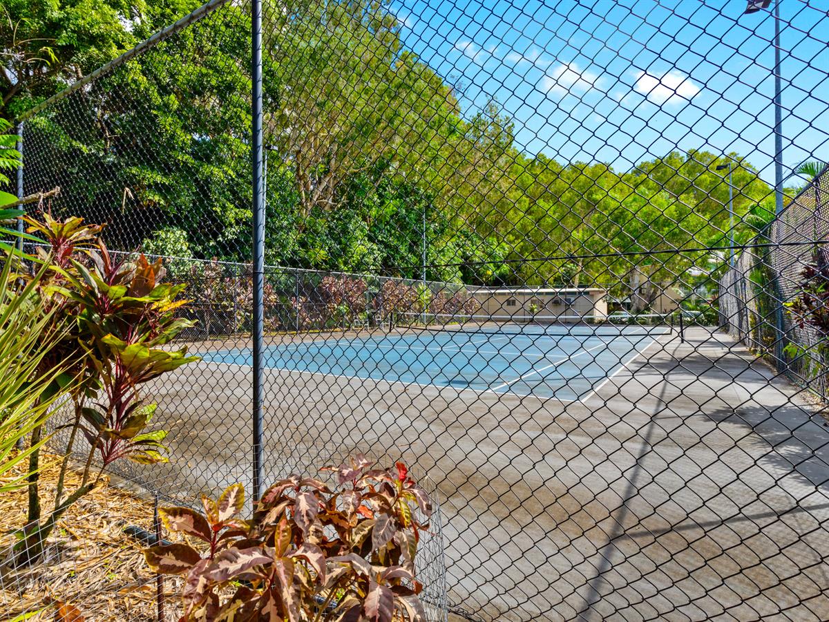lush tropical gardens and walkways, along with a saltwater pool with a sandy beach, plus an additional lap pool, sauna, spa, 4 BBQ areas, plus a full sized tennis court . Modern kitchen with dishwasher, and open plan tiled living/dining