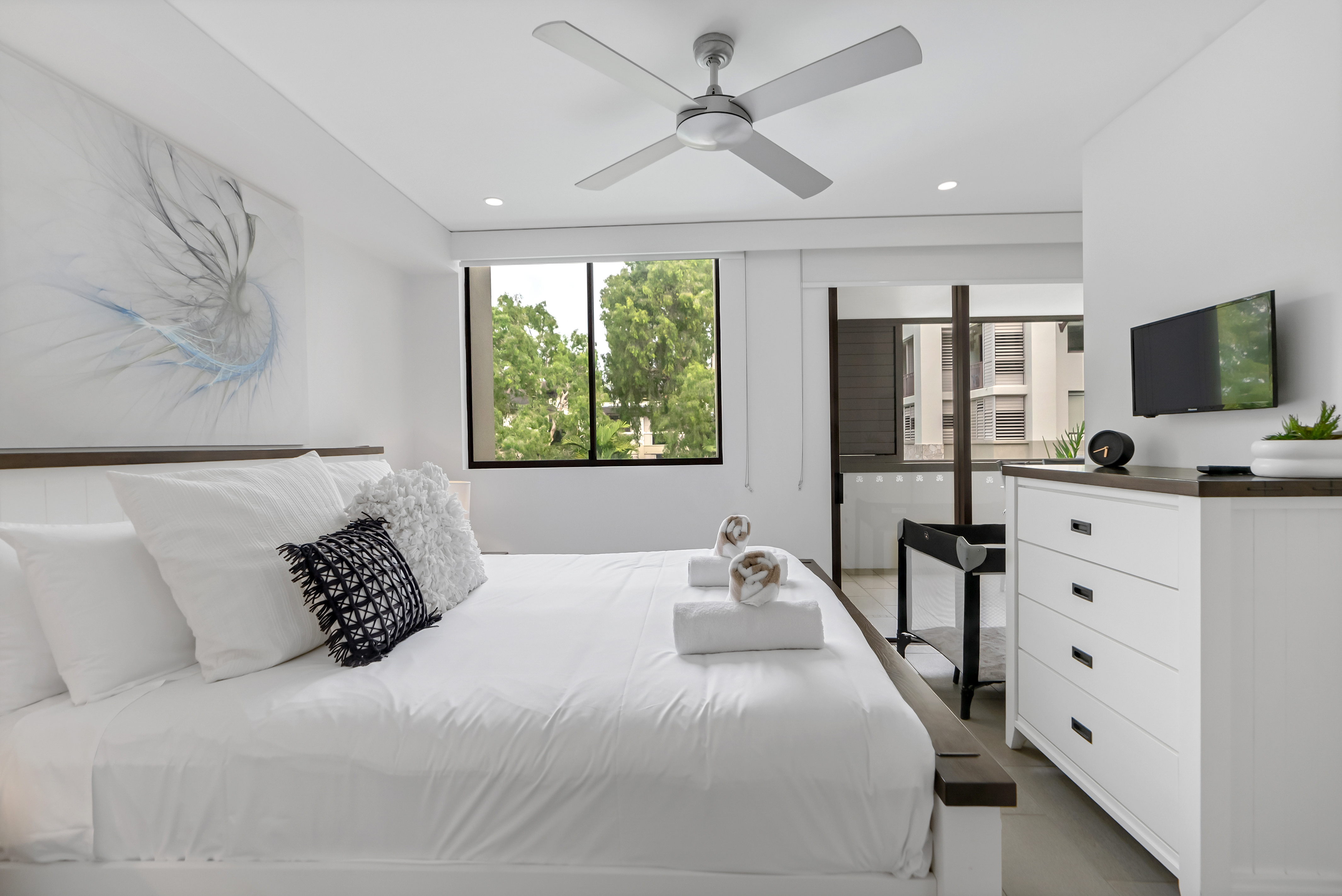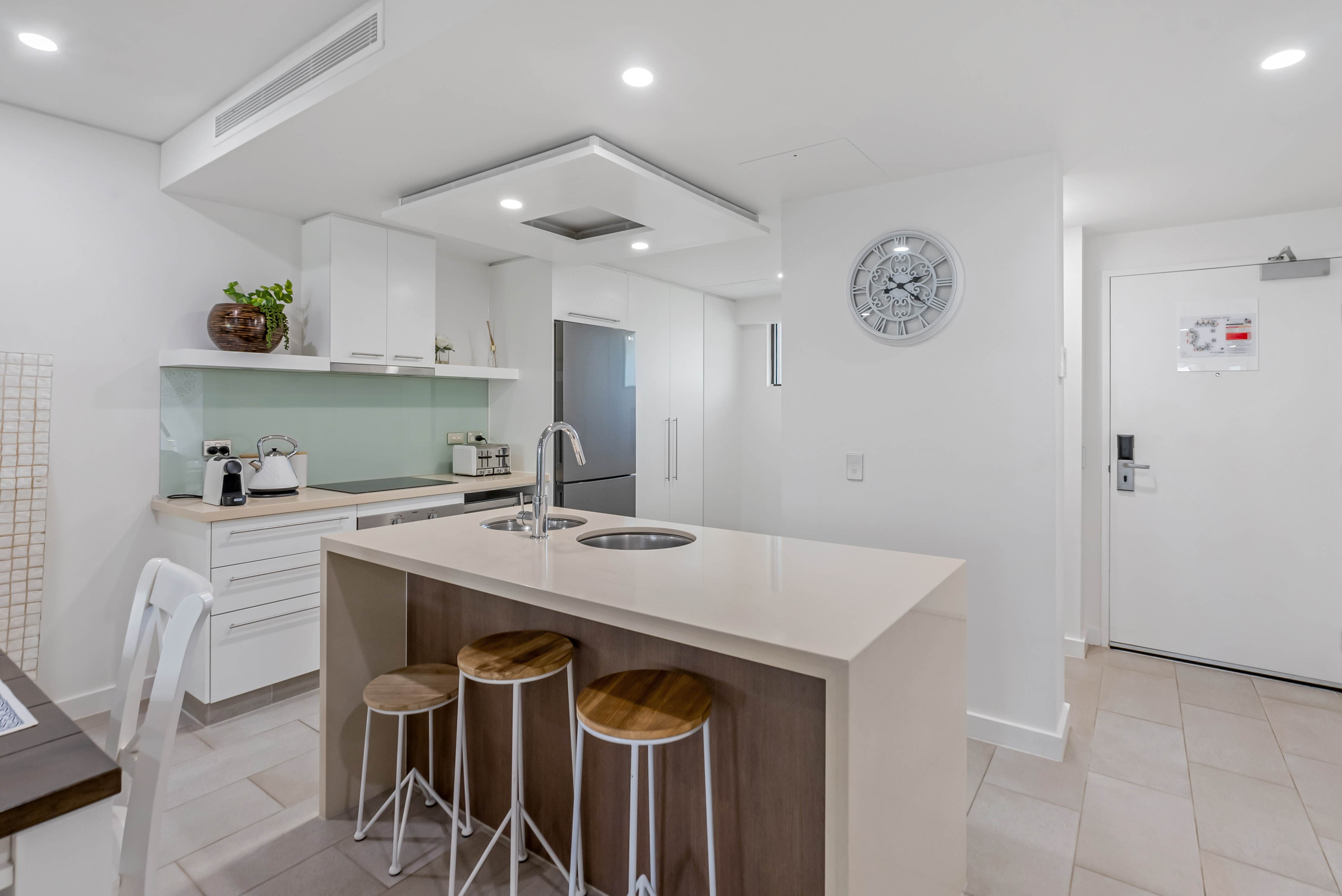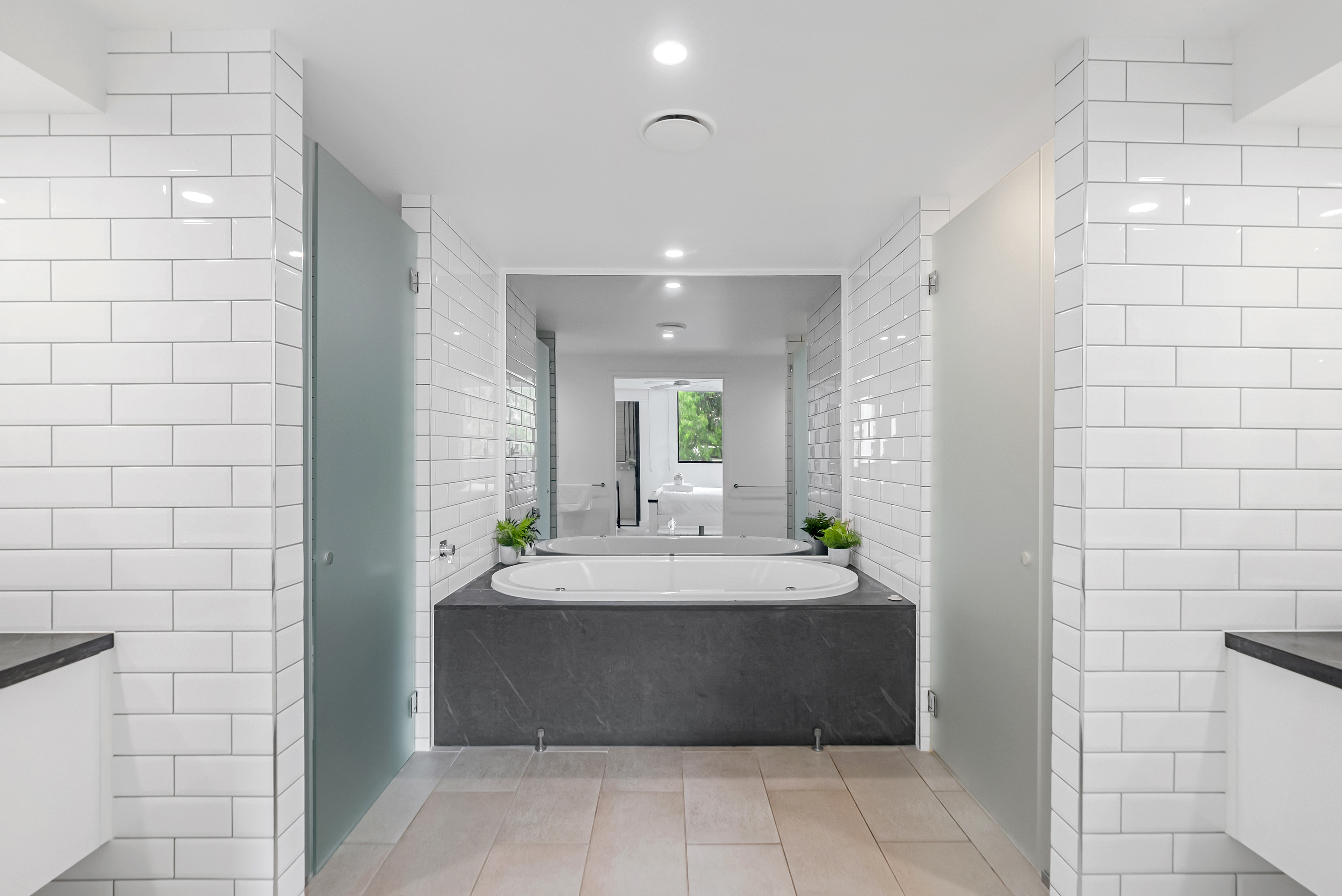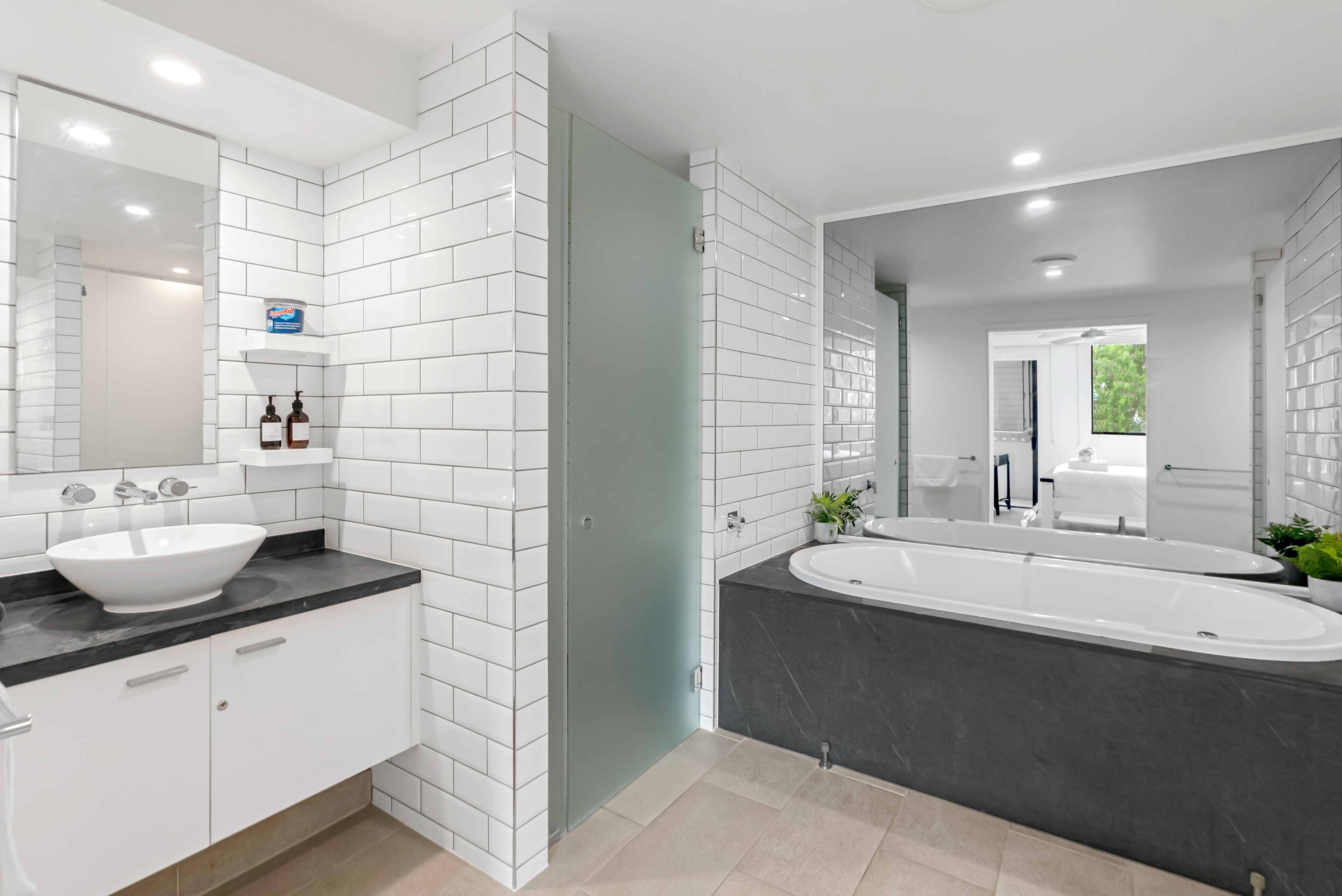 The well-appointed kitchen boasts ample storage and bench space, making it a delight for the home chef. Both bedrooms feature ensuites and direct access to their own balconies, ensuring privacy and convenience. The master suite and studio even include spas in the bathrooms, adding a touch of indulgence to your everyday routine.